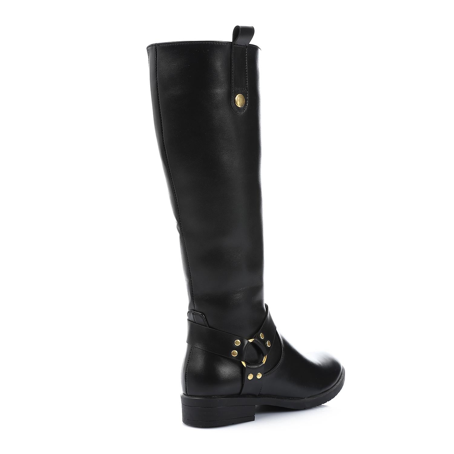 - Key Features: Decorative harness strap with gold-tone rings and studs around the ankle. Strap on the side to expand the boot from the calf for a custom fit.