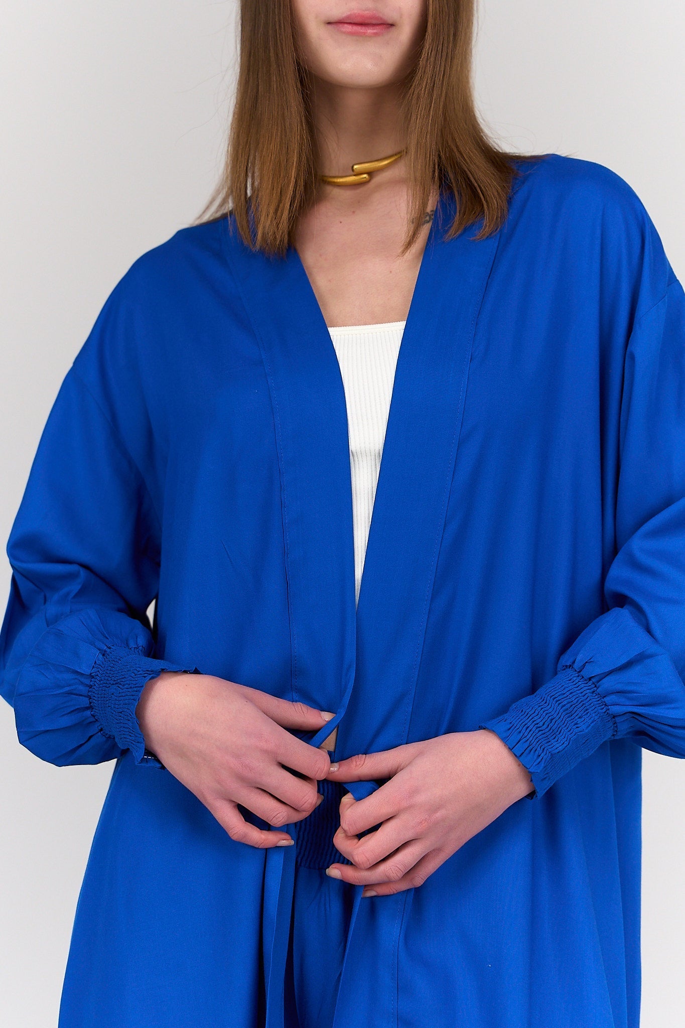 The Tencel Kimono is a stylish and lightweight layering piece with a relaxed fit and solid pattern, making it a versatile wardrobe essential. The open neckline and long sleeves with elastic cuffs add a touch of elegance and comfort. Its midi length and side slits create a flowing silhouette, perfect for effortless styling. Designed for ease and comfort, it’s an easy-to-wear option for various occasions.