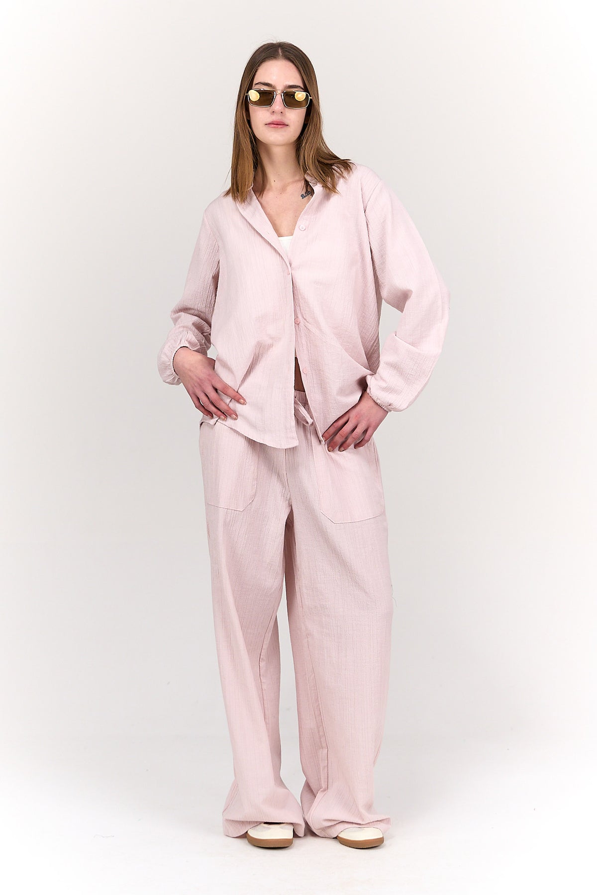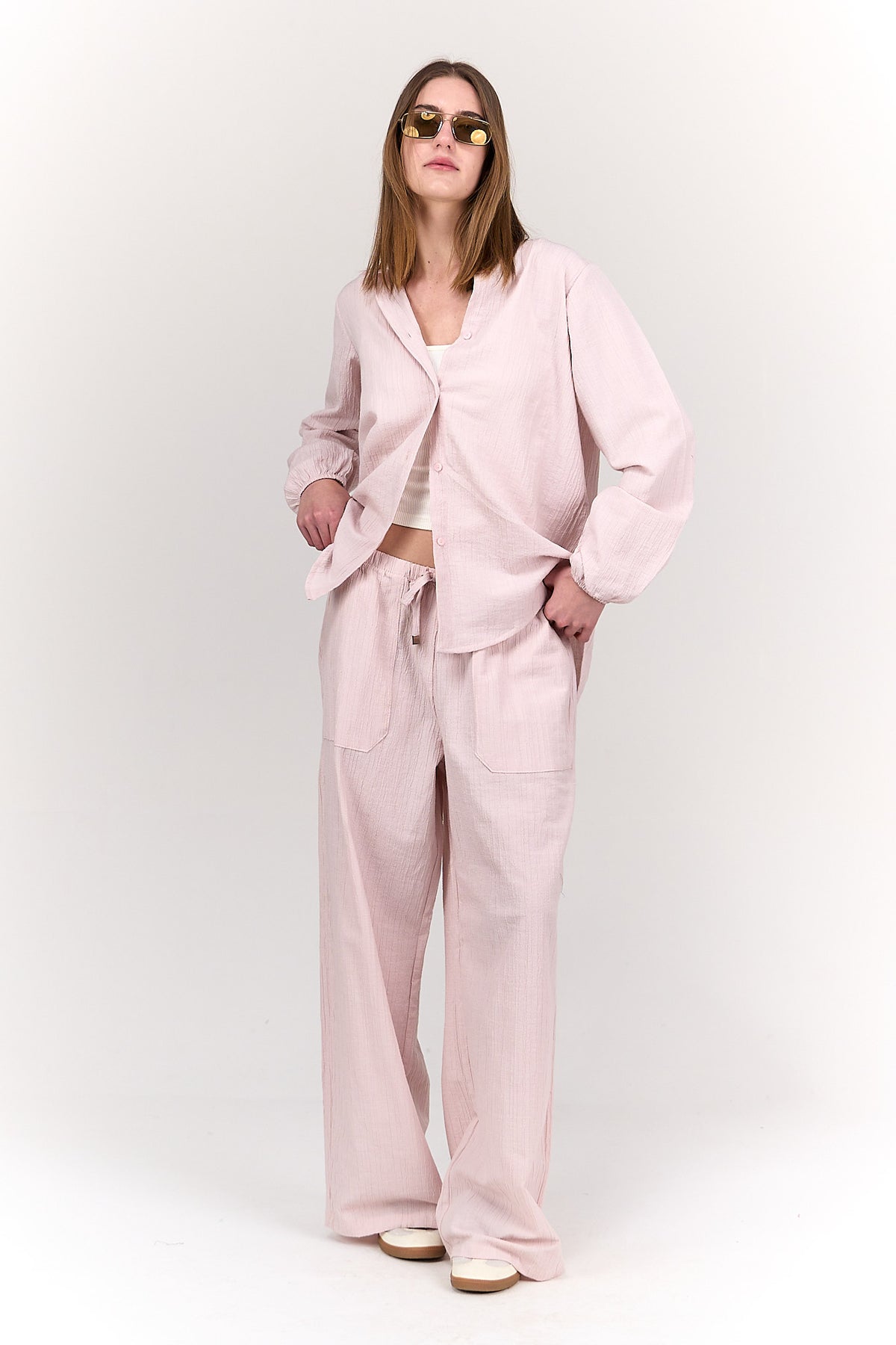 Crafted from Tencel with a subtle self-patterned texture, this loose-fit shirt offers both comfort and style. The stand collar and button-down closure with a full placket give it a polished, versatile look, while the long sleeves and round hem add a relaxed touch. Designed for easy wear, this shirt can be paired with its matching pants for a coordinated outfit that’s perfect for casual and smart-casual settings.