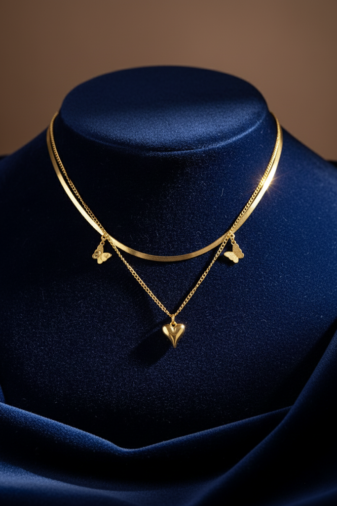 - Key Features: Two-layer necklace with flat herringbone chain and delicate charm chain, polished gold-tone finish, heart and butterfly details for a graceful, feminine appeal.