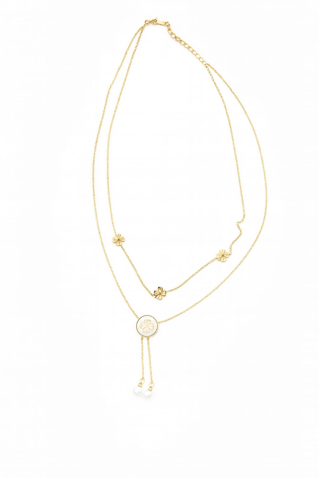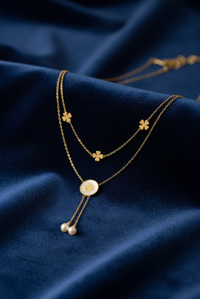 - Key Features: Layered design combining minimal clover charms with a circular pendant, accented by twin dangling pearls for a refined finish. Perfect balance of charm and sophistication.