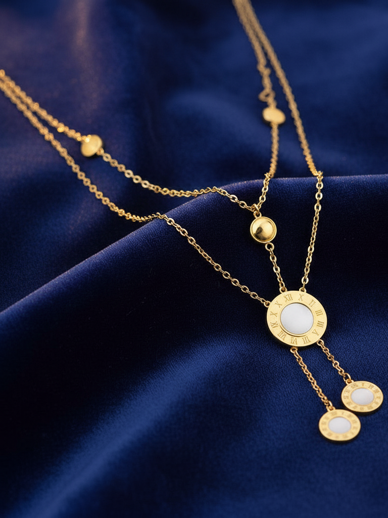 - Key Features: Double-layered chain with Roman numeral engraved pendants, white enamel inlays, polished gold finish, adds an elegant and timeless touch to any look.