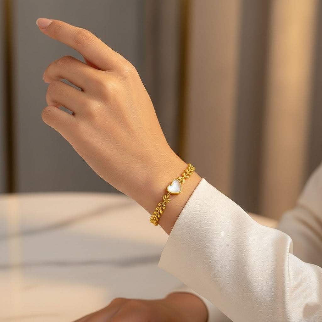- Key Features: Intricate leaf chain design, iridescent shell heart centerpiece, refined gold-plated finish, versatile layering style