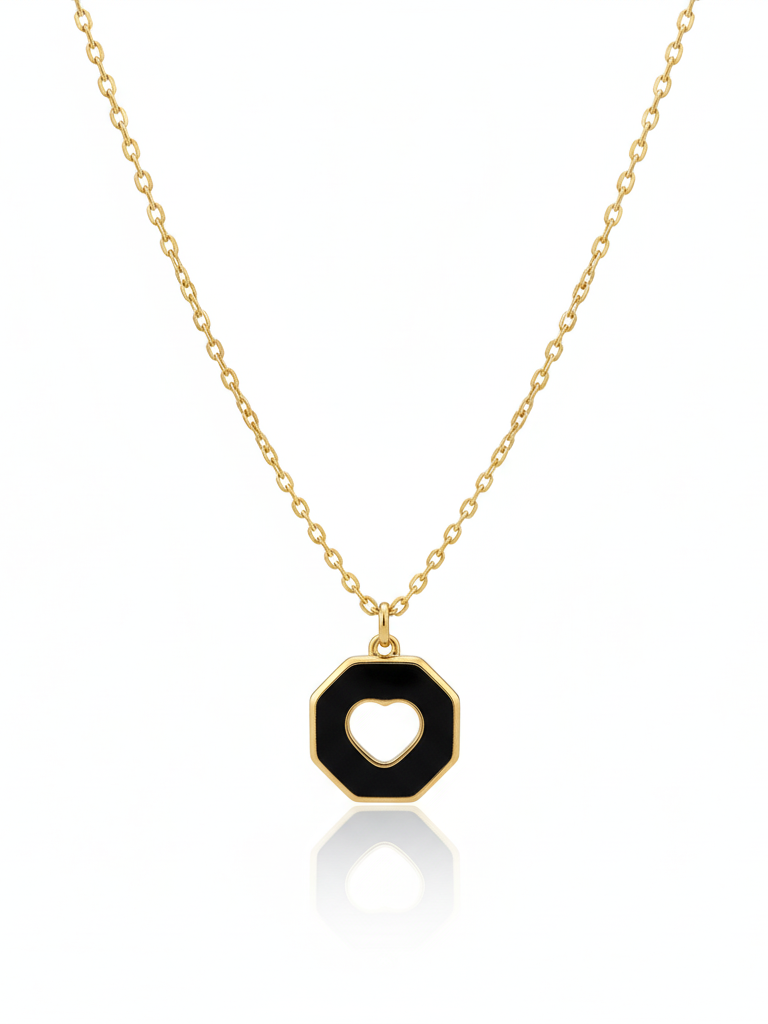 - Key Features: Unique octagonal pendant with a glossy black surface and central heart-shaped cut-out. Framed with polished gold edges for contrast. Hypoallergenic, tarnish-resistant, and perfect for adding a refined modern touch.