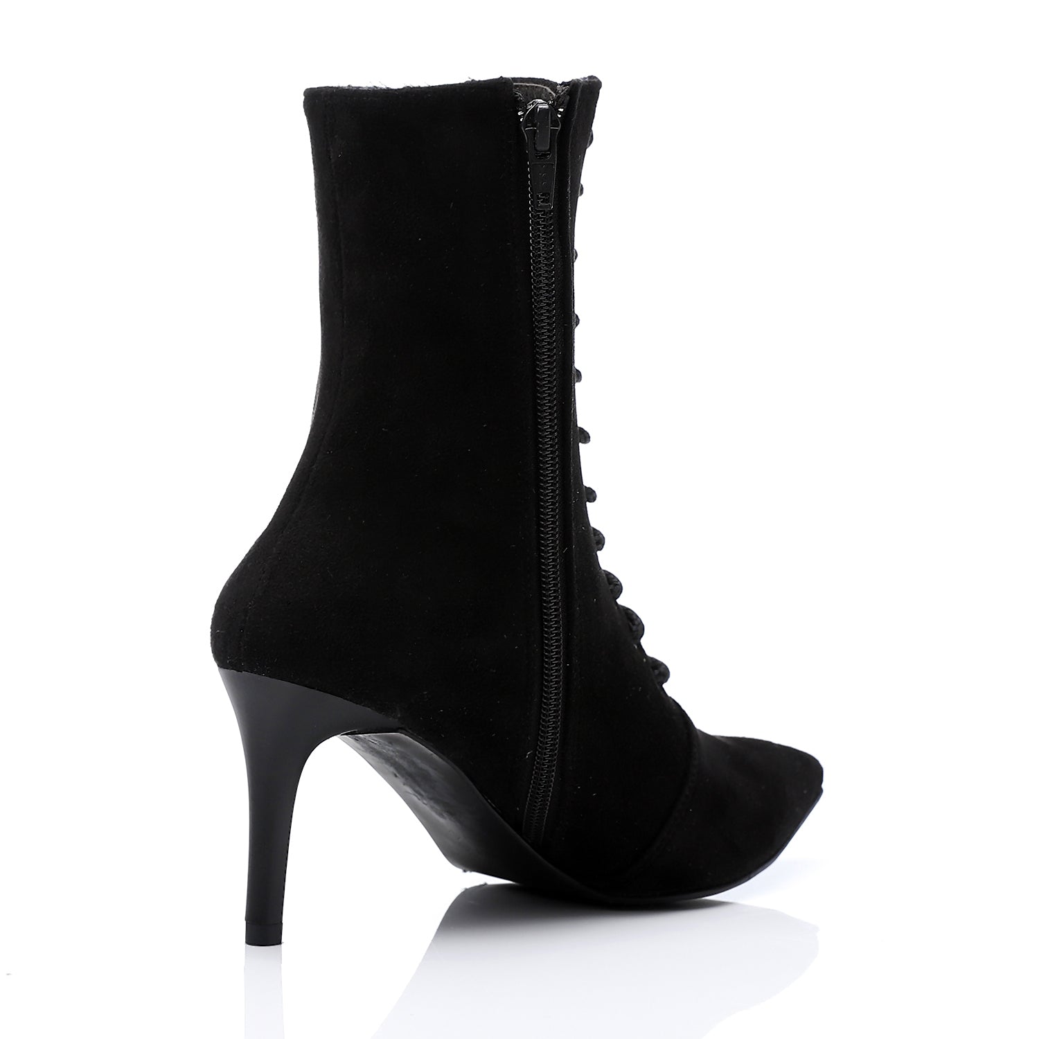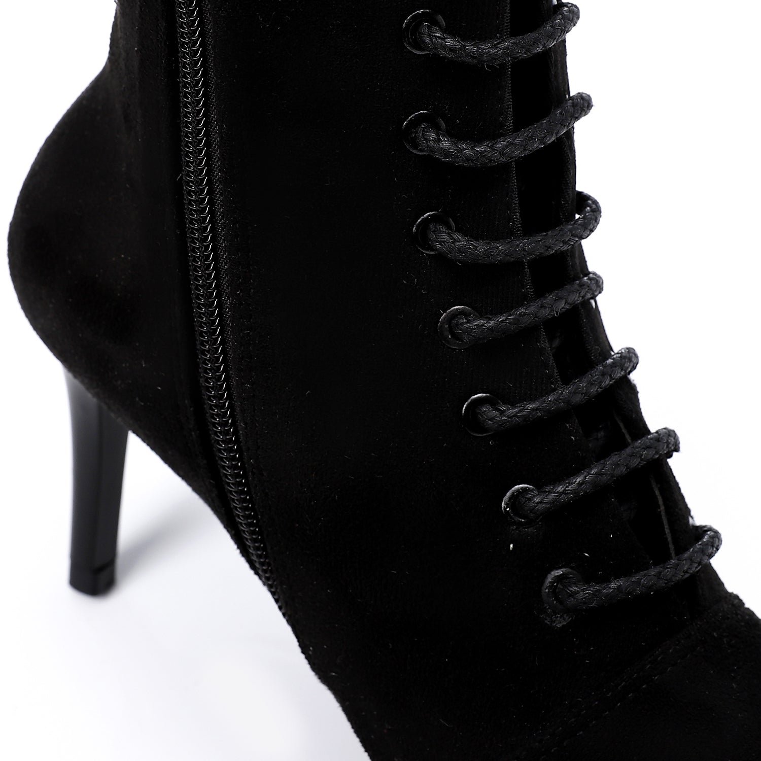Key Features: Elegant suede texture, pointed toe for sleek style, secure lace-up with side zipper, supportive stiletto heel