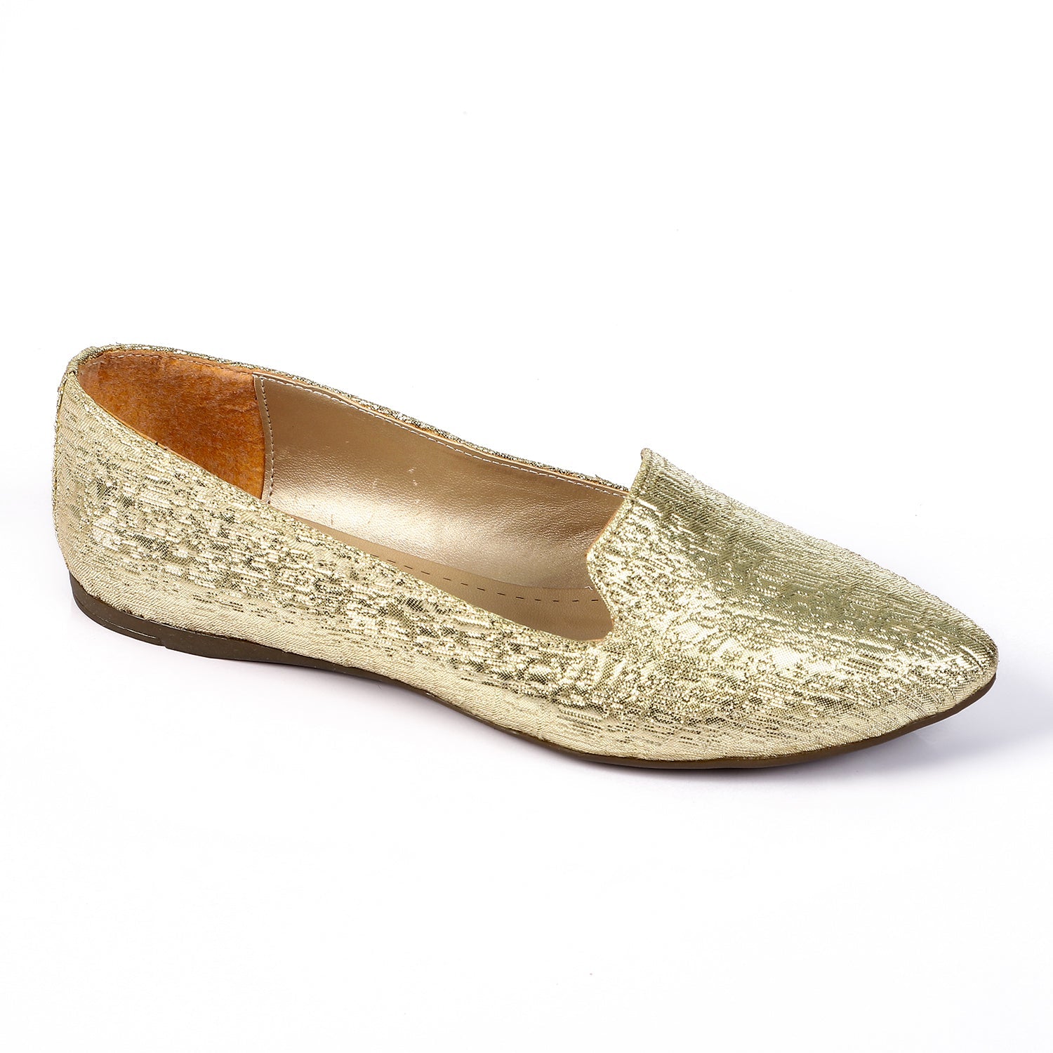 - Key Features: Metallic gold finish, pointed toe design, lightweight and flexible sole