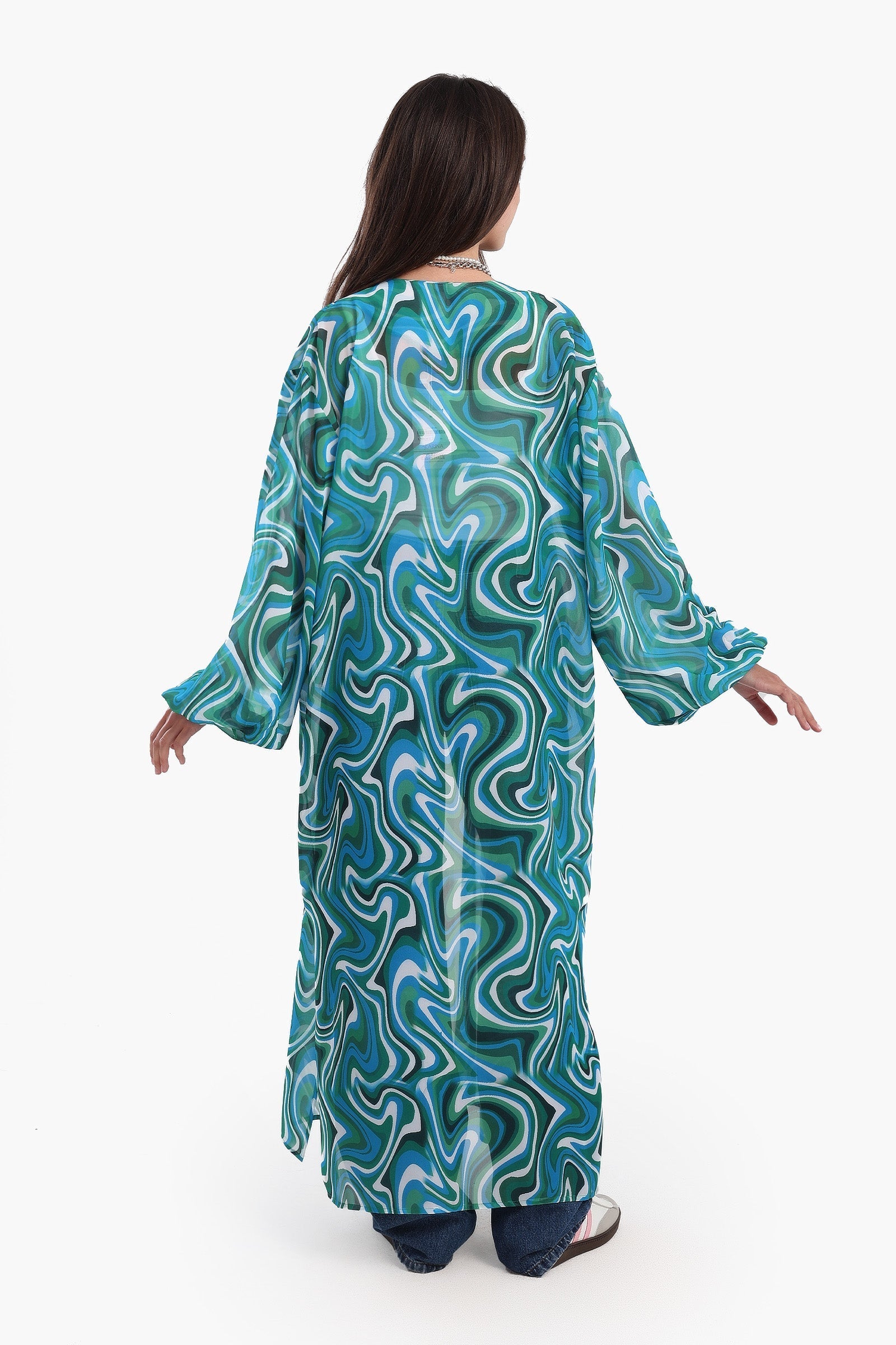 Elevate your wardrobe with this versatile Printed Kimono, designed to combine style and comfort effortlessly. Featuring a relaxed fit and a captivating printed pattern, this kimono is a perfect layering piece for any occasion. The open neckline and long sleeves with elastic cuffs add a touch of elegance and functionality, while the side slits and midi length ensure a flattering, flowy silhouette. With its easy-to-wear design, this kimono is a must-have for adding a statement-making layer to your outfit.