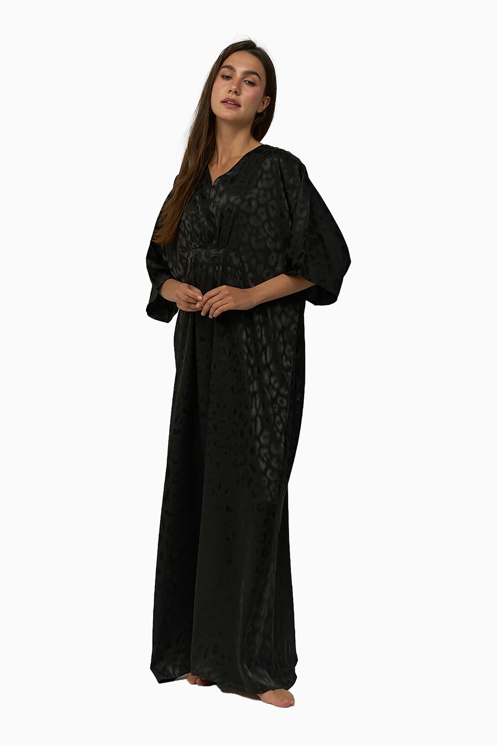 This black satin jacquard long nightgown exudes luxury and comfort with its loose fit and subtle jacquard pattern. The V-neckline and elbow-length sleeves give it a sophisticated touch, while the full-length design ensures graceful coverage. Crafted from soft satin, it drapes beautifully on the body, offering an elegant yet relaxed feel. Its slip-on style makes it perfect for effortless lounging or a peaceful night’s sleep.