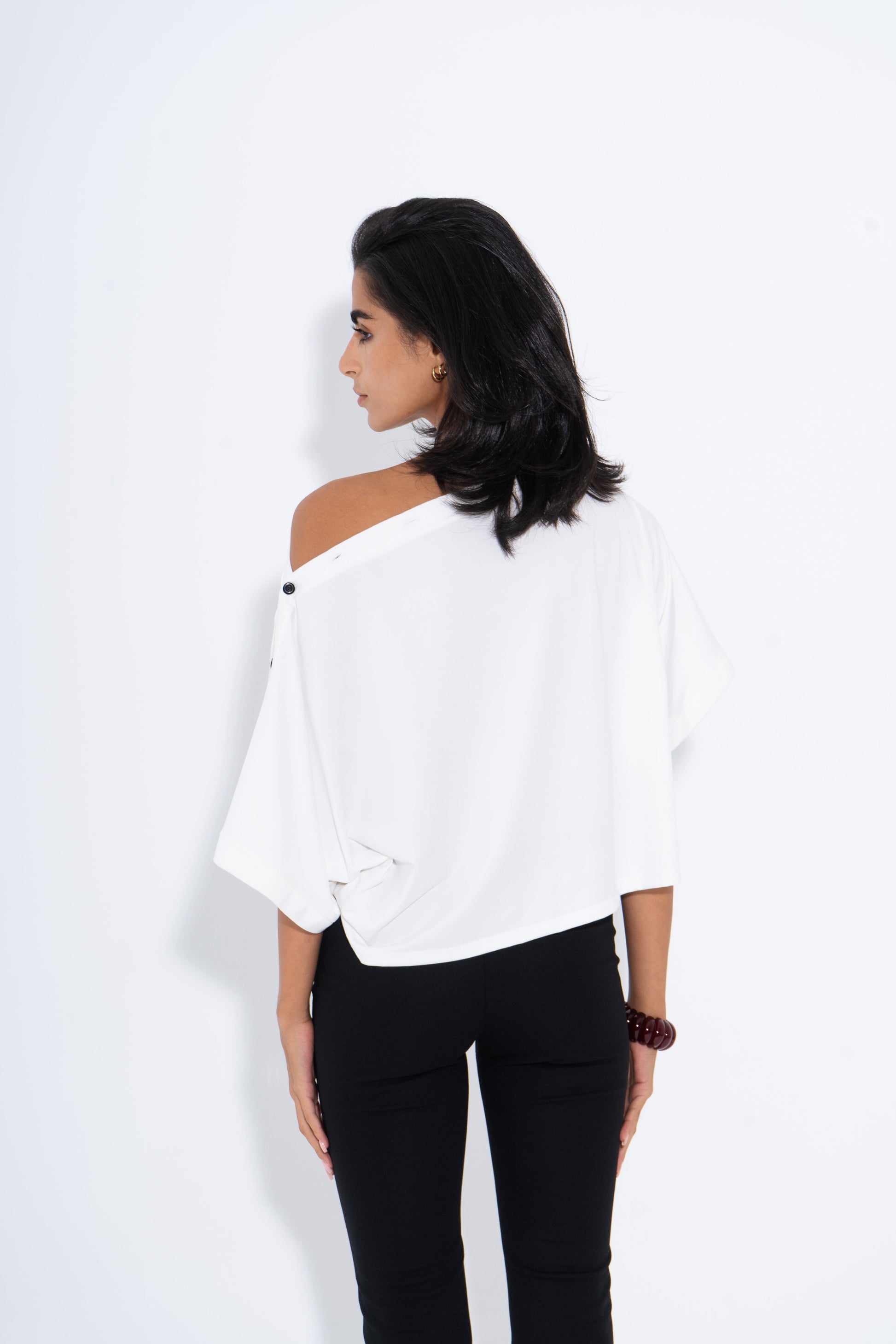 Cotton Lycra Solid Buttoned Shoulder Top – White