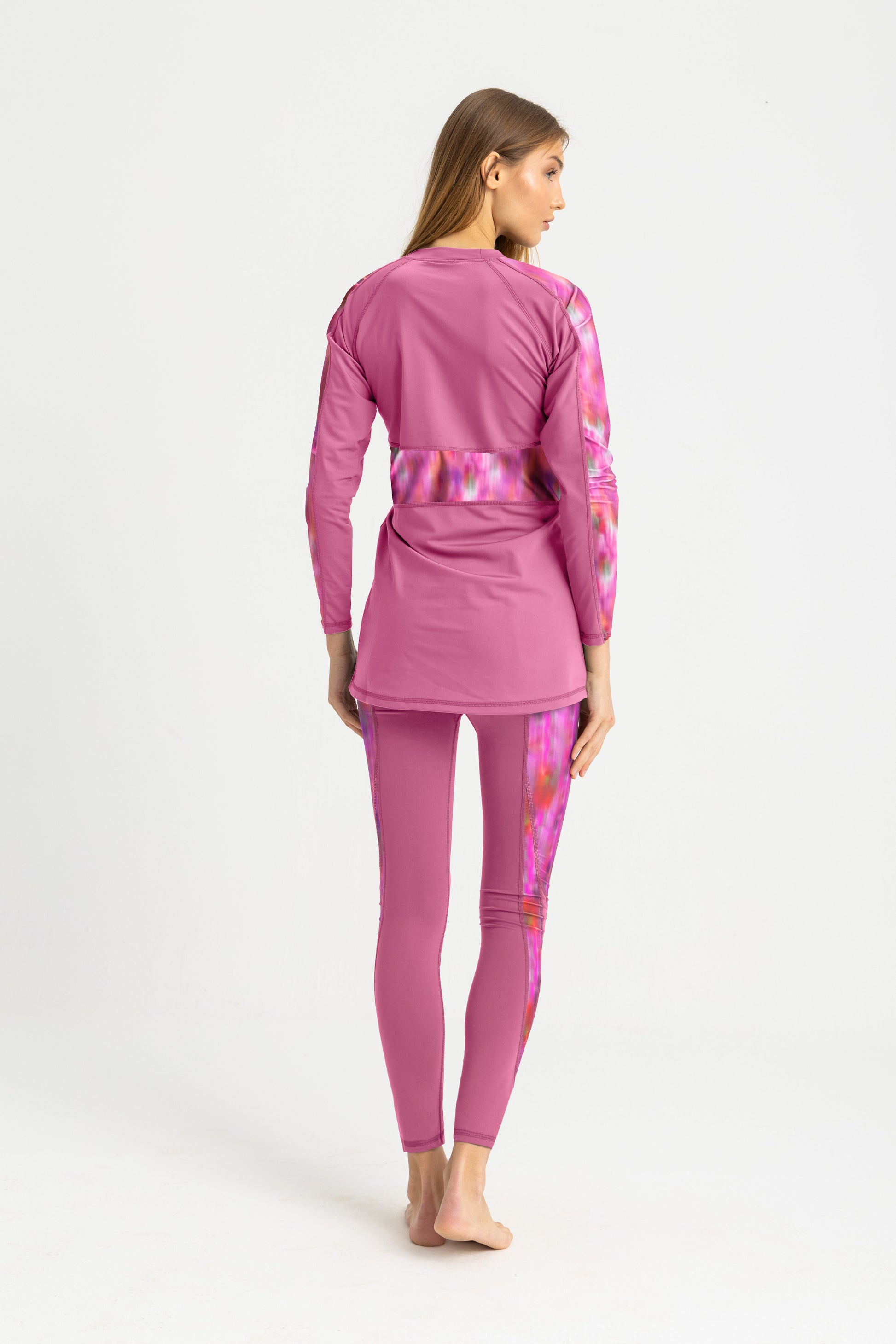 Top Design & Fit: Long-sleeve swim tunic with contrast palm-print panels; slim yet modest fit