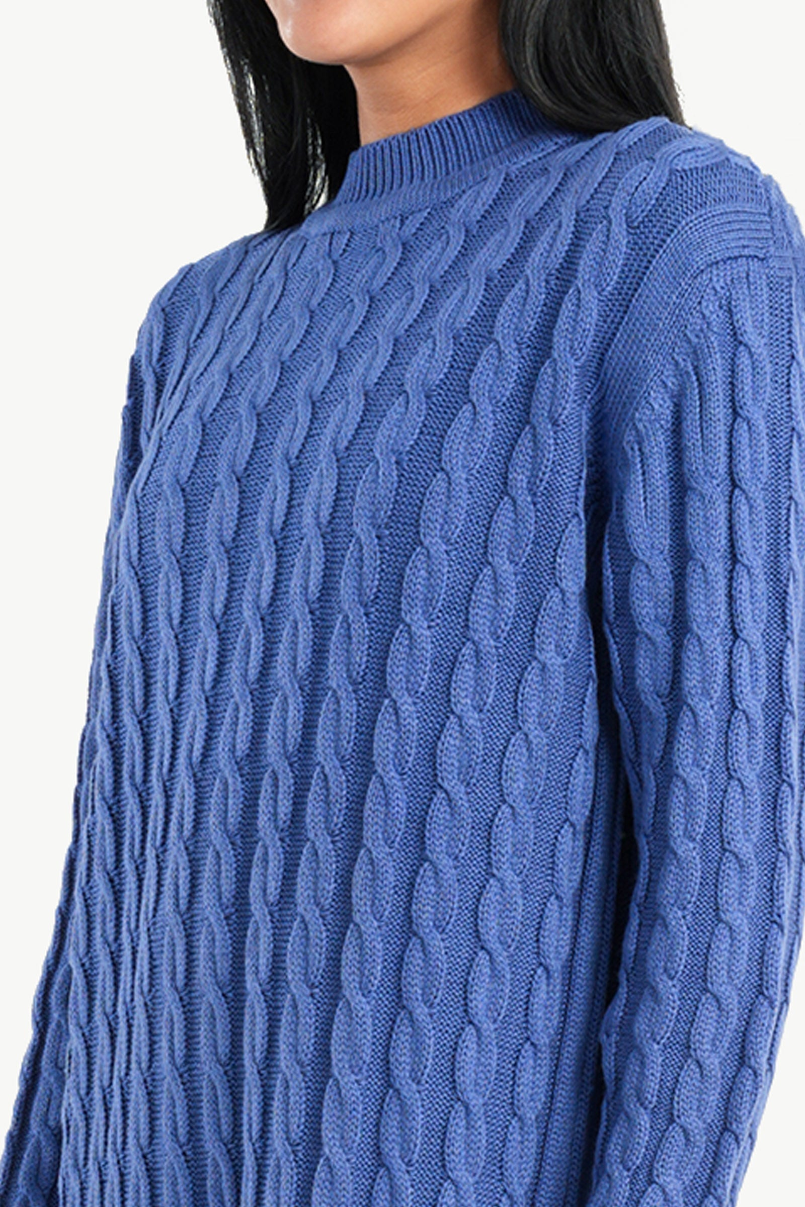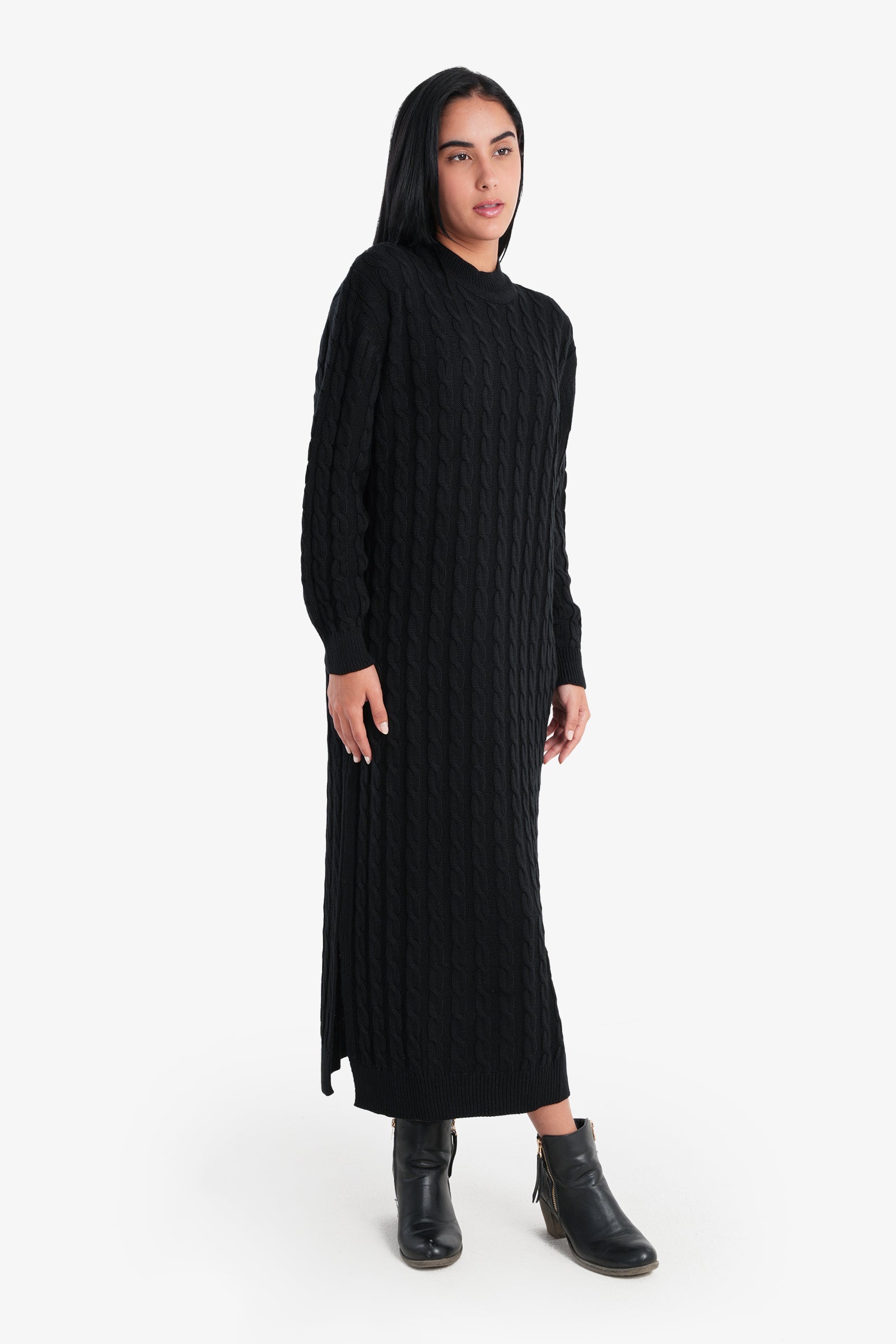 This wool dress is the perfect blend of warmth and style, making it an ideal choice for chilly days. Featuring a classic cable-knit pattern, it offers both texture and visual interest. The regular fit ensures comfort while maintaining a flattering silhouette. A high neck and long sleeves provide extra warmth, and the dropped shoulders add a relaxed, modern touch. The midi length, complete with side slits, allows for ease of movement and adds a subtle hint of allure. With a simple slip-on design, this dress is as easy to wear as it is stylish.