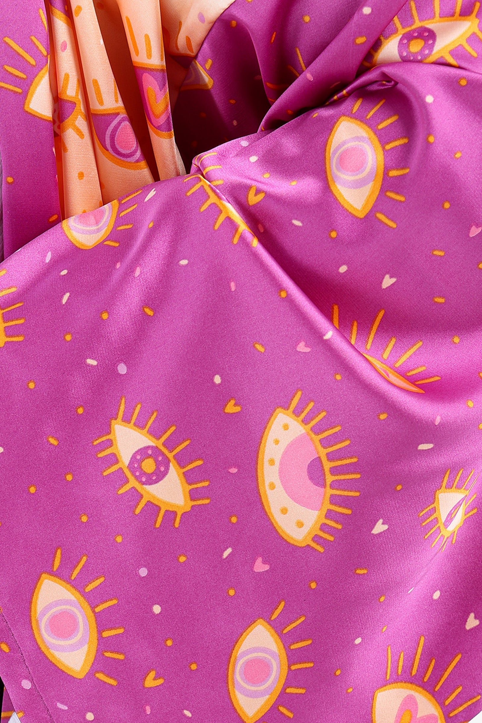 - Introducing our Color Block Satin Kimono, a luxurious and eye-catching piece that adds a touch of elegance to any outfit! This kimono features a unique color block design with an all-over eye print that adds a playful and whimsical touch. The satin material drapes beautifully over the body, creating a chic and sophisticated look. The midi length and wide long sleeves add a sense of drama, making this kimono perfect for special occasions or adding a statement to your everyday look. Crafted from high-quality satin material, this kimono is soft to the touch and comfortable to wear all day long.