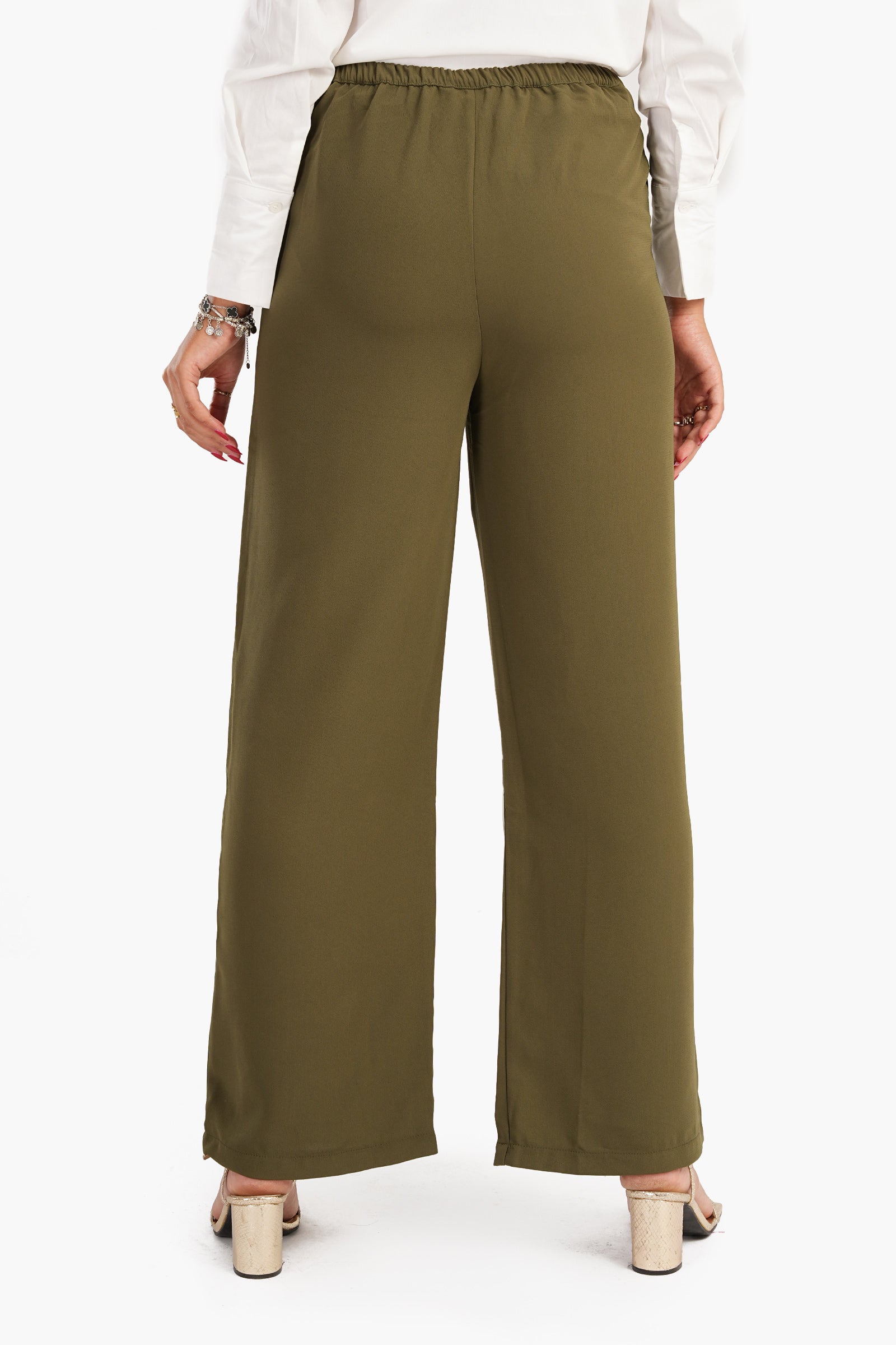 These elegant pants, crafted from lightweight crepe fabric, offer a perfect balance of comfort and style. The regular fit and high waist create a flattering silhouette, while the straight cut elongates the legs for a sleek appearance. The solid pattern and minimal design make these pants versatile for a variety of occasions. The elastic waistband with a drawstring ensures a secure and adjustable fit, making them easy to wear and ideal for both casual and semi-formal looks. Their full-length design adds a touch of sophistication, making them a go-to piece for effortless style.