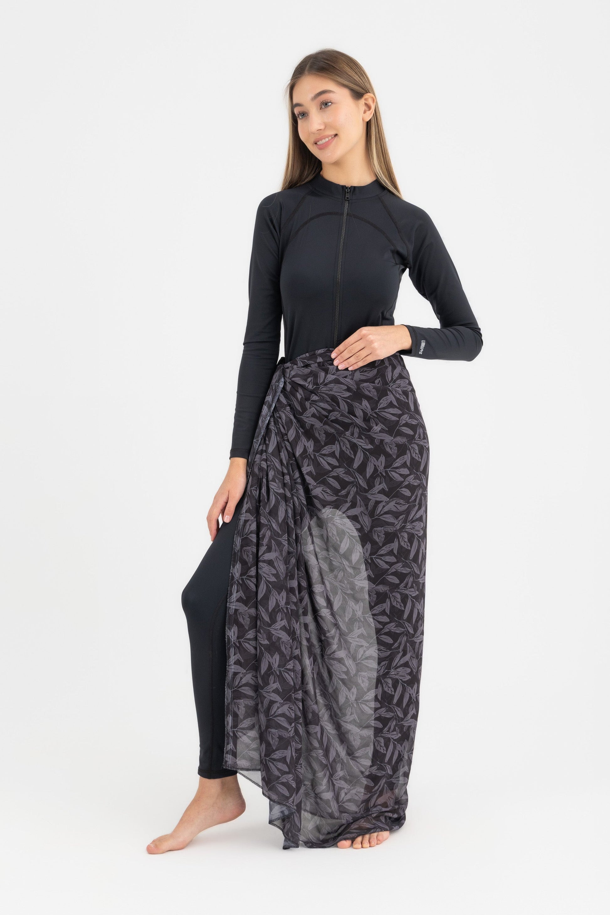 Top Design & Fit: Long-sleeve fitted swim top integrated into the suit with wave-print side panels
