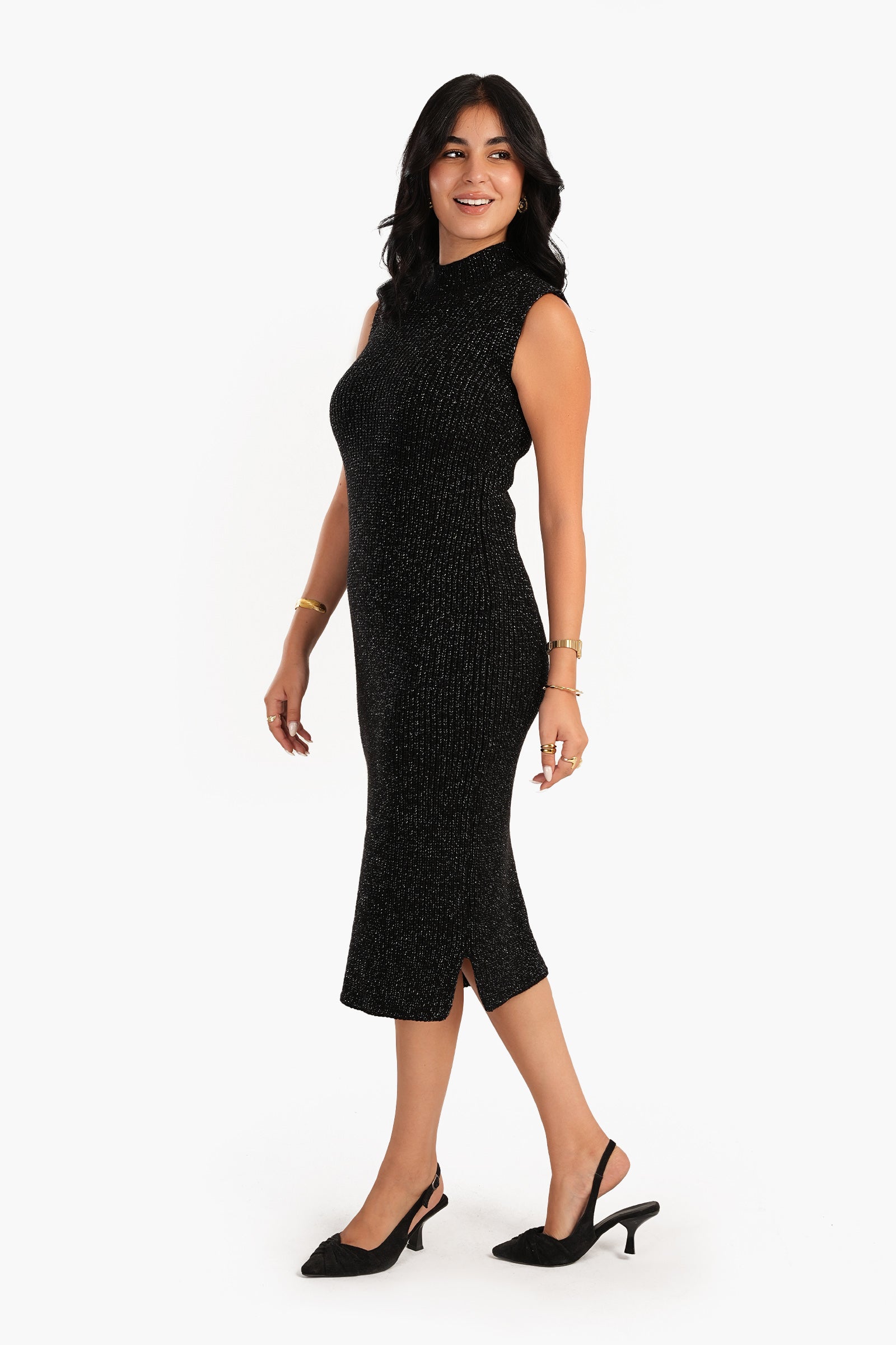 This sleek acrylic blend dress is designed to offer both warmth and style, making it a perfect choice for cool-weather outings. Featuring a slim fit, the dress hugs your figure while maintaining a comfortable stretch, thanks to its soft knitted pattern. The high neck adds a touch of elegance, while the sleeveless design ensures ease of movement and versatility for layering. Falling to a flattering midi length, the dress is enhanced with side slits for added comfort and a chic, modern edge. Its slip-on style makes it effortless to wear, perfect for transitioning from day to night with ease.