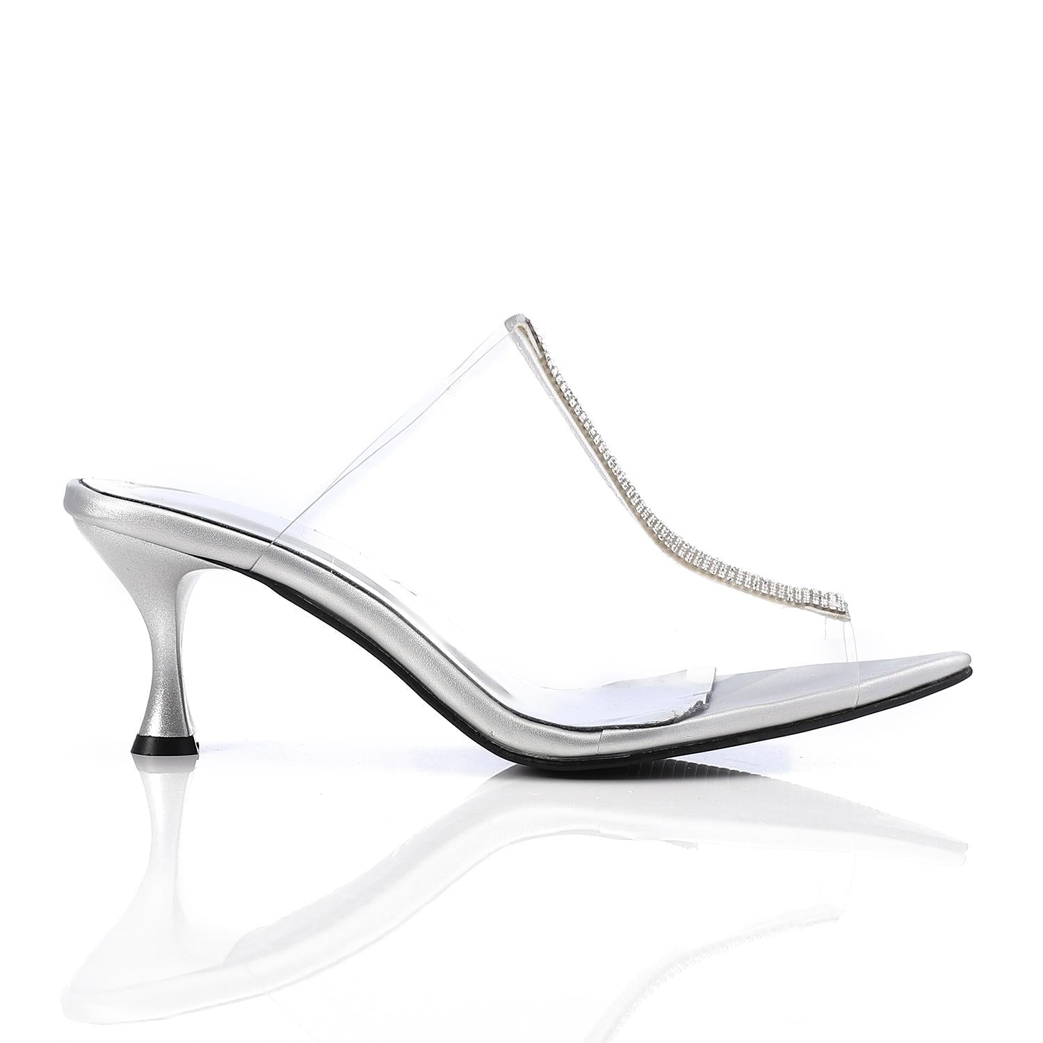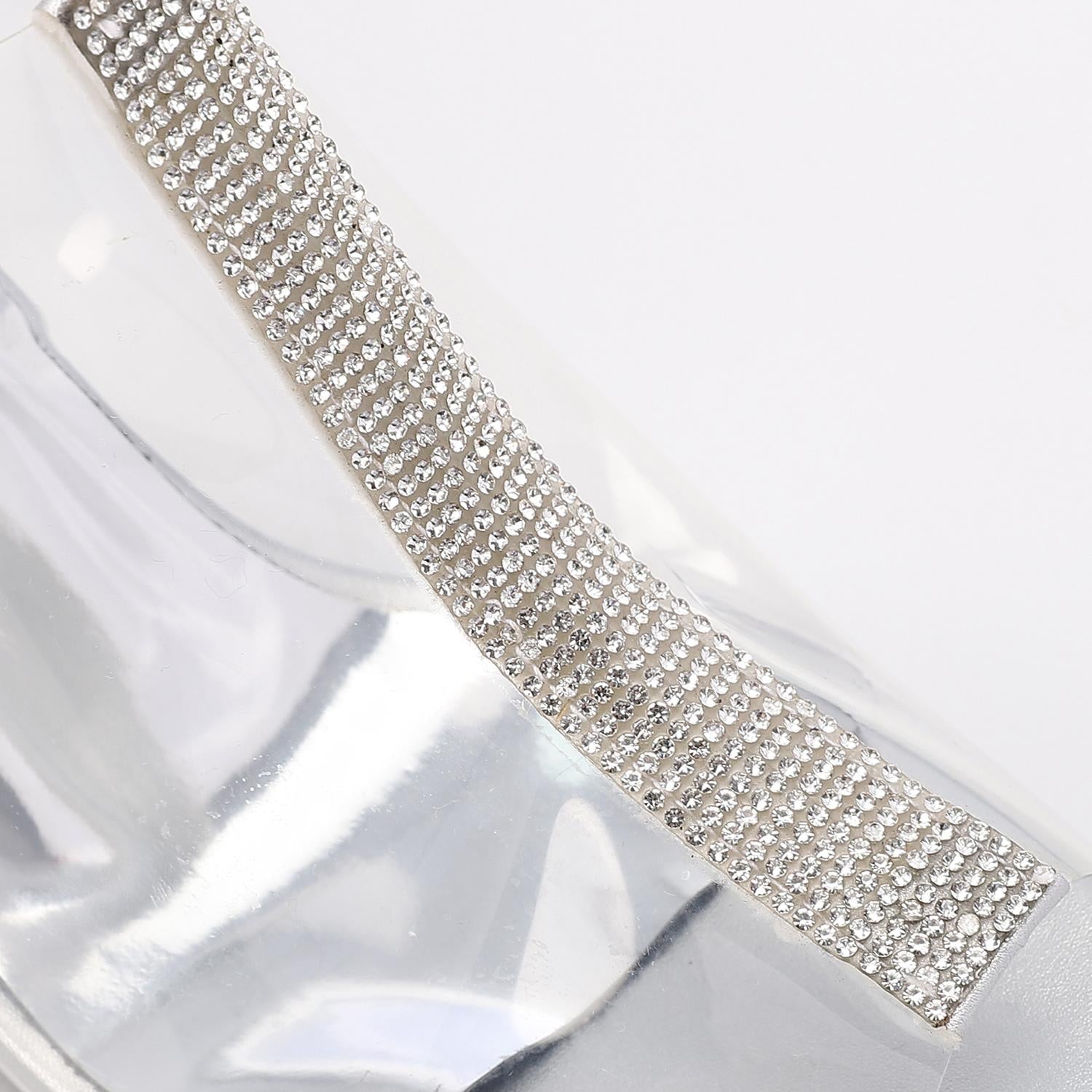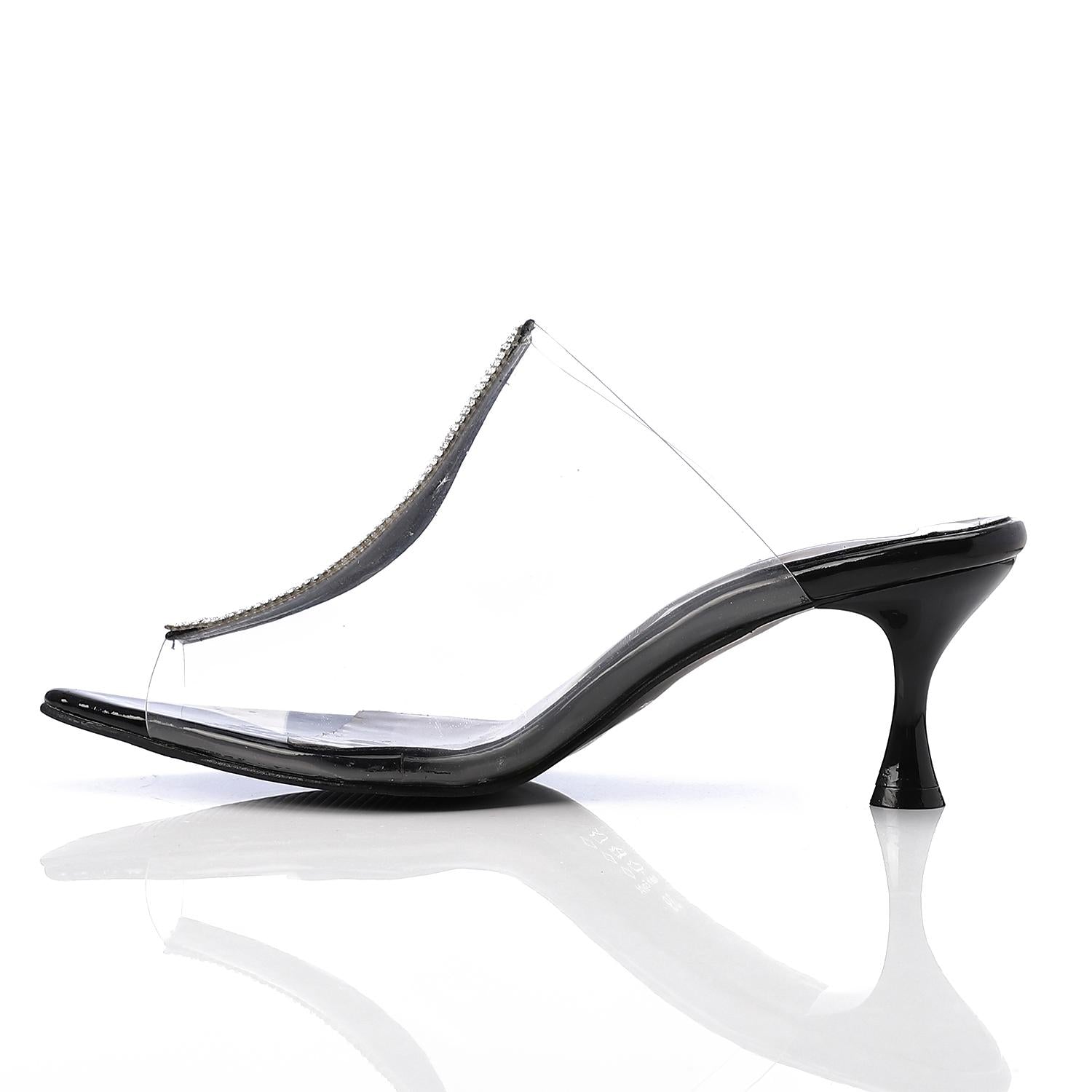 Key Features: Trendy transparent upper, elegant 5 cm kitten heel, rhinestone embellishment, and sharp black patent toe.