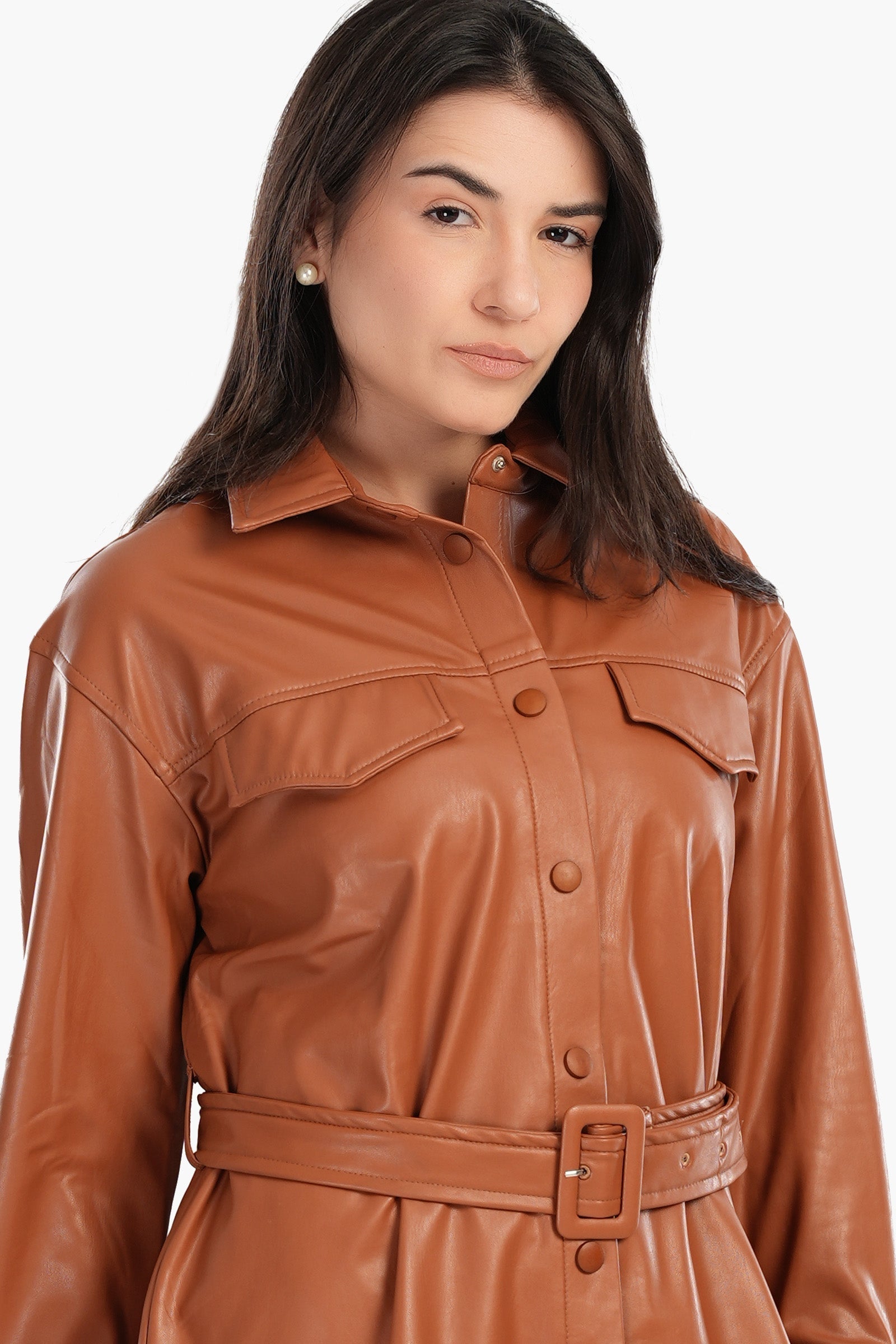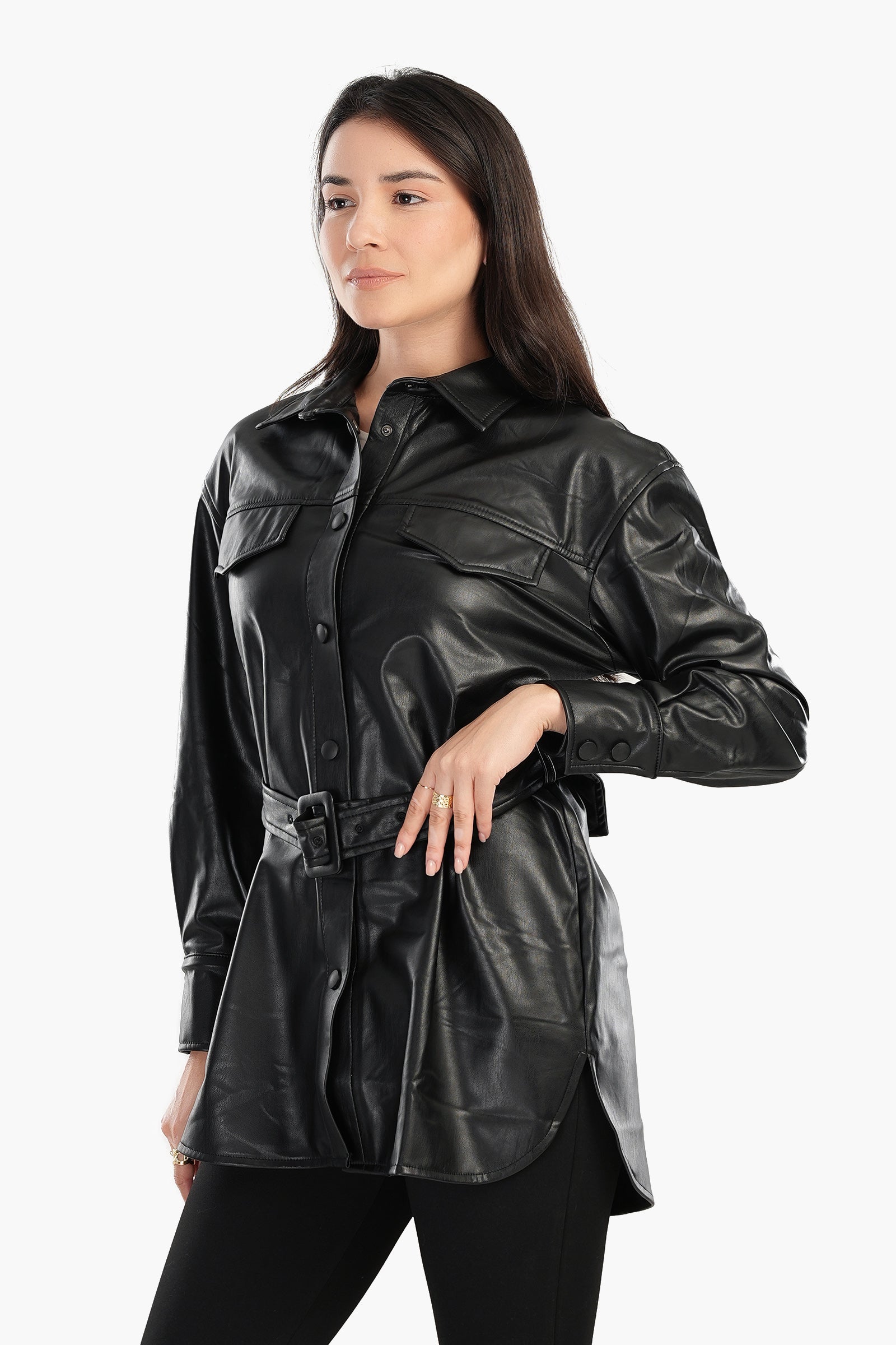 This leather shirt is designed with a regular fit and a solid pattern, exuding a bold and sophisticated vibe. The collared neck and snap button closure with a full placket offer a classic shirt silhouette, while the addition of a waist belt adds a stylish, cinched-waist detail. Long sleeves and flap pockets enhance its functionality and style. The rounded hem gives a modern finish, making it a versatile piece for various occasions.