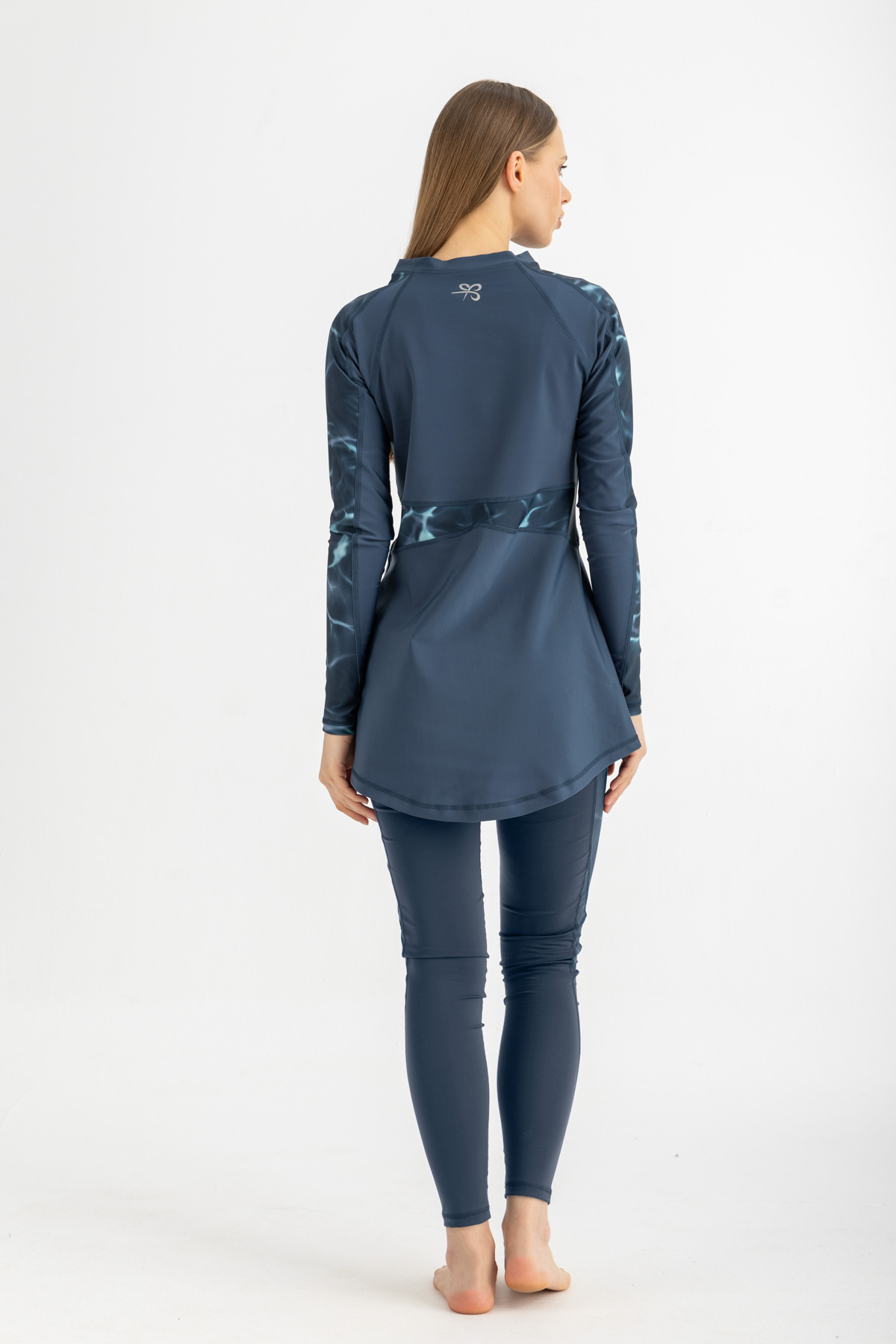 - Top Design & Fit: Long-sleeve swim tunic with contrast palm-print panels; slim yet modest fit