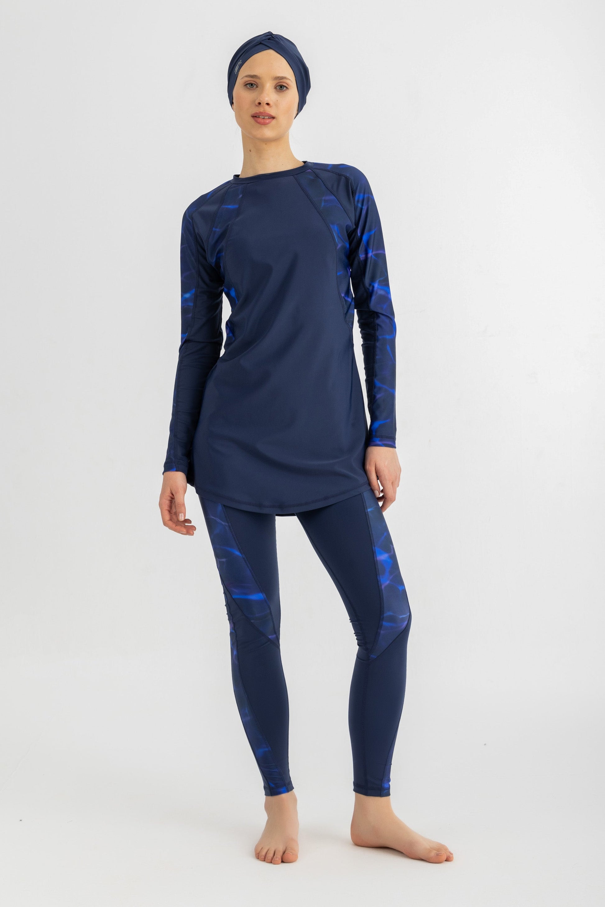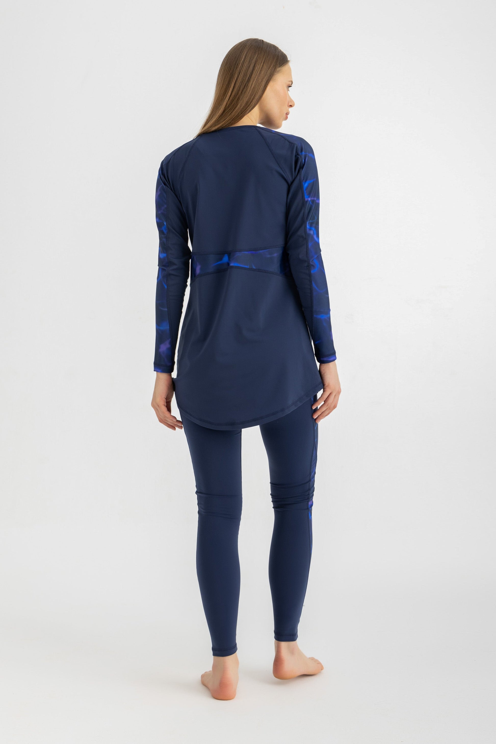- Top Design & Fit: Long-sleeve swim tunic with contrast palm-print panels; slim yet modest fit