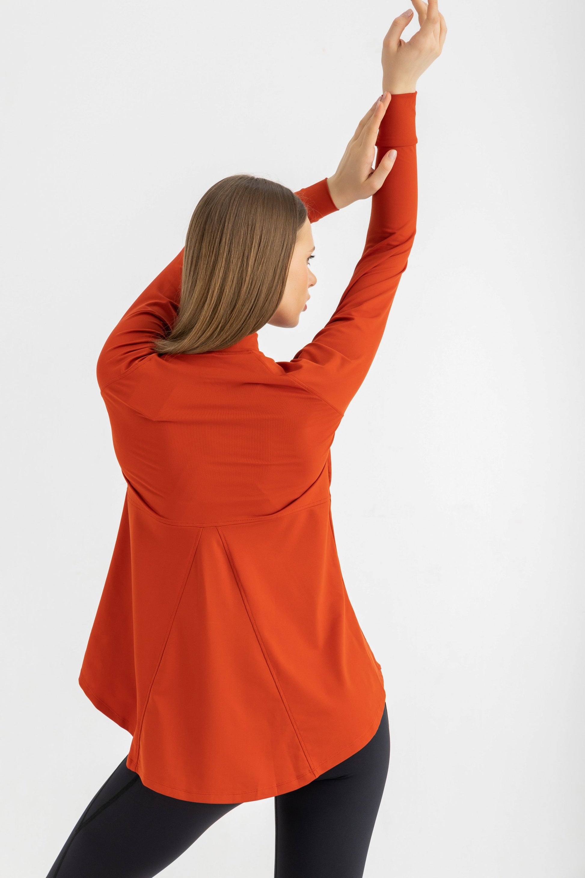 Design: Streamlined active top with front half-zip, pleated back detail, and thumbhole sleeves for added function