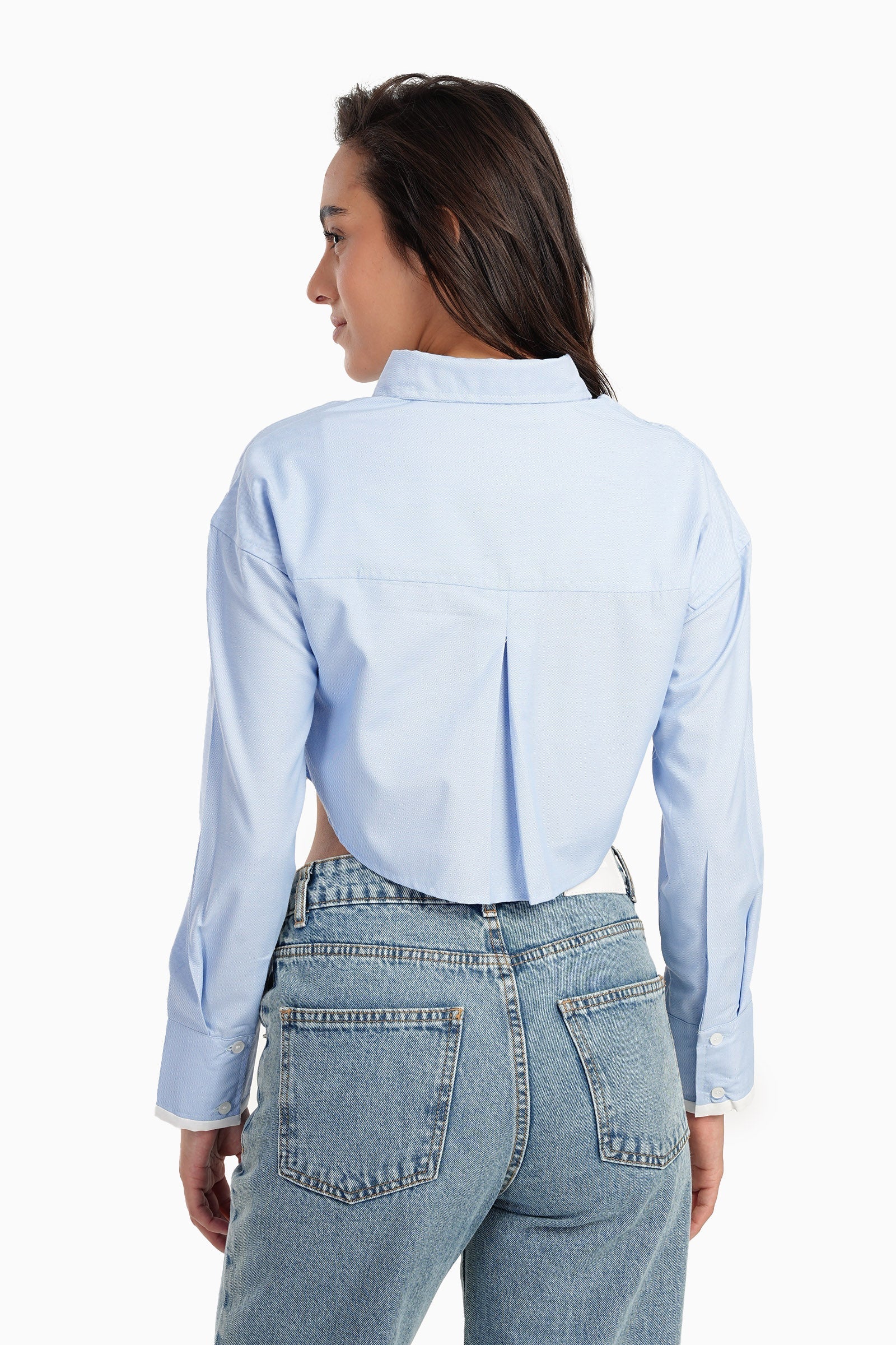 Upgrade your wardrobe with this stylish light blue cropped shirt, perfect for making a fashion statement. Made from a breathable fabric, it offers a comfortable regular fit with a solid pattern. The shirt features a classic collared neck, full button-down closure, and long sleeves with buttoned cuffs for a refined look. The cropped design adds a trendy, modern twist, making it perfect for pairing with high-waisted bottoms. Two front chest pockets with flaps add both function and style. This shirt is the perfect balance between casual and chic, offering a versatile and easy-to-wear option for any season.