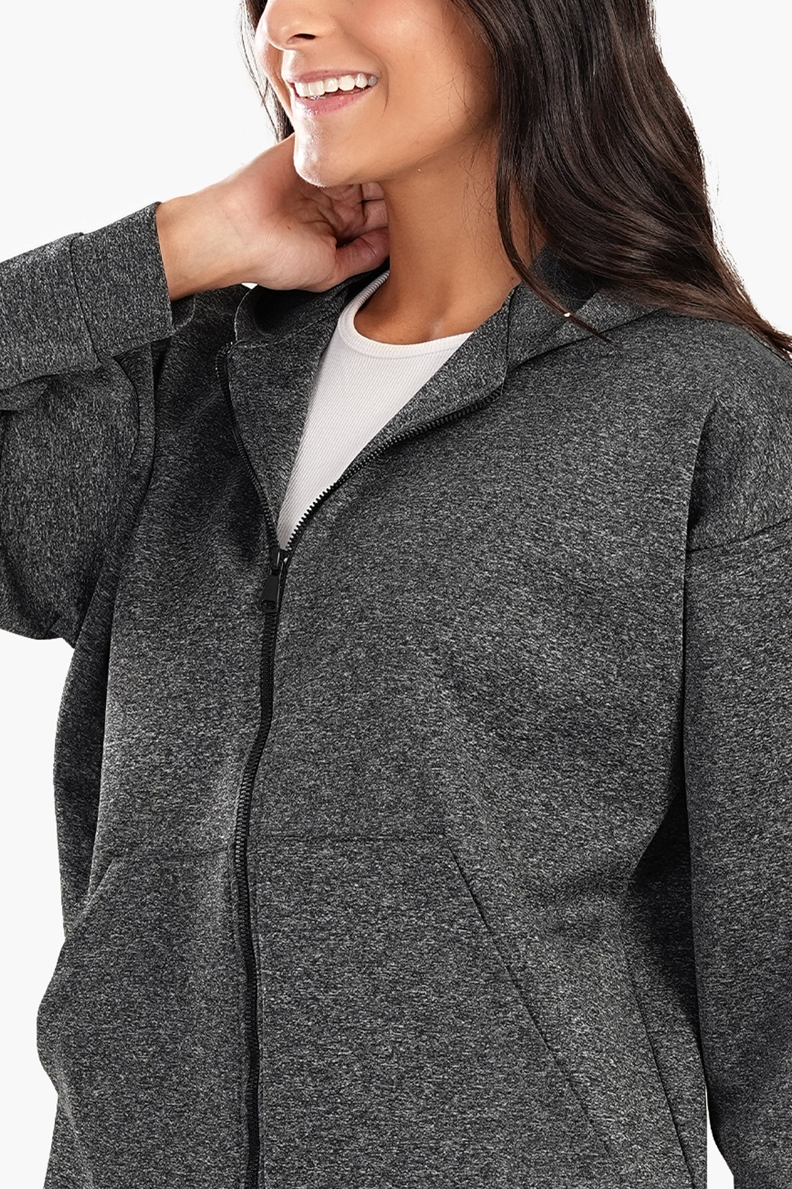 This Lounge Jacket is crafted from lightweight Polyester with a stylish heather pattern, offering a perfect combination of comfort and style. With its relaxed fit and functional hooded collar, this jacket is designed for cozy wear. It features a convenient zipper closure and long sleeves for added warmth. The unique side slits and asymmetrical design make it both fashionable and practical, perfect for layering over your favorite lounge outfits.