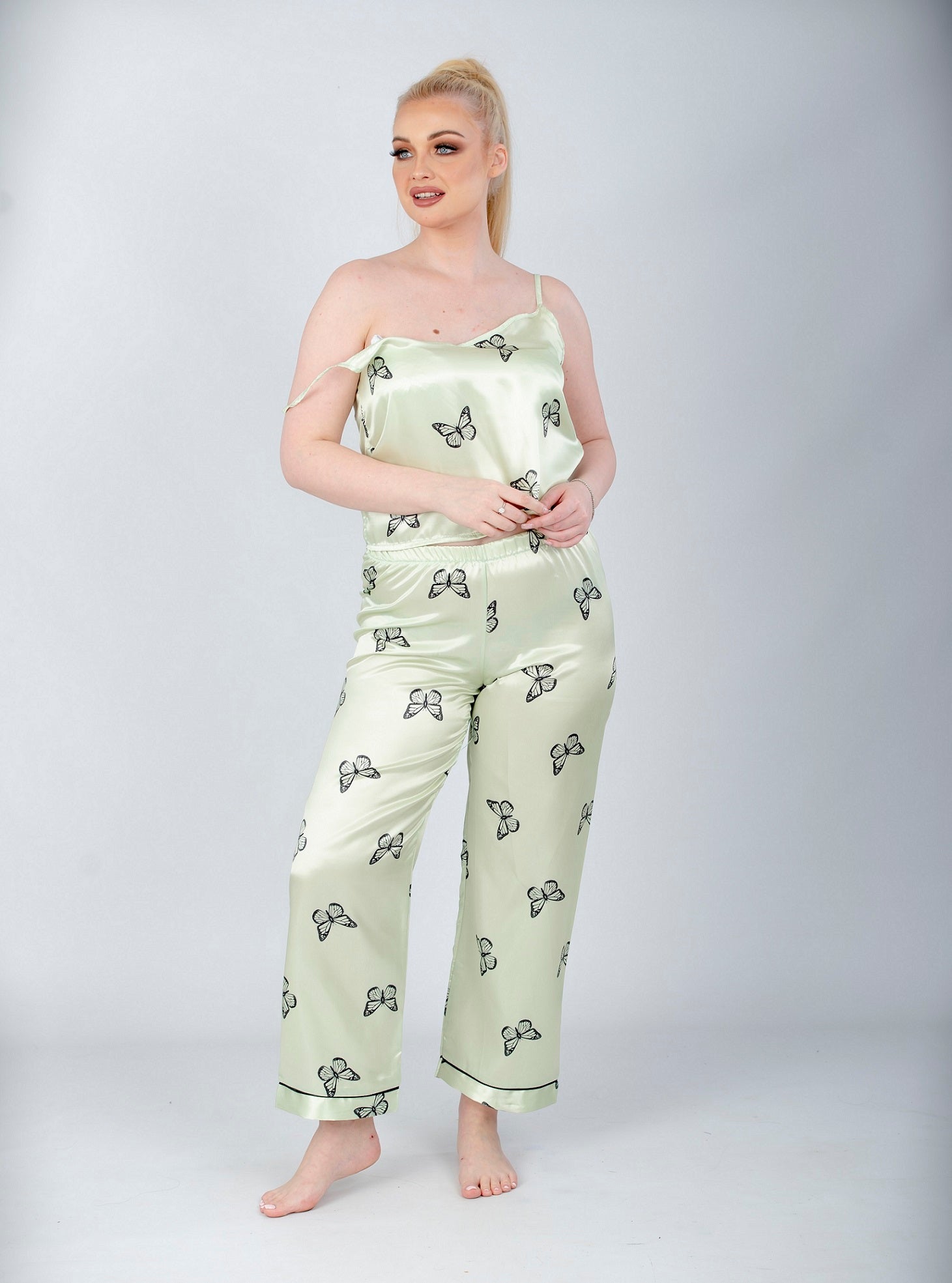Embrace the magic of butterflies with Shechick's luxurious 3-Piece Satin Pajama Set in Mint. This enchanting sleepwear features a delicate butterfly print on soft, flowing satin, creating a dreamlike and comfortable haven for your slumber.