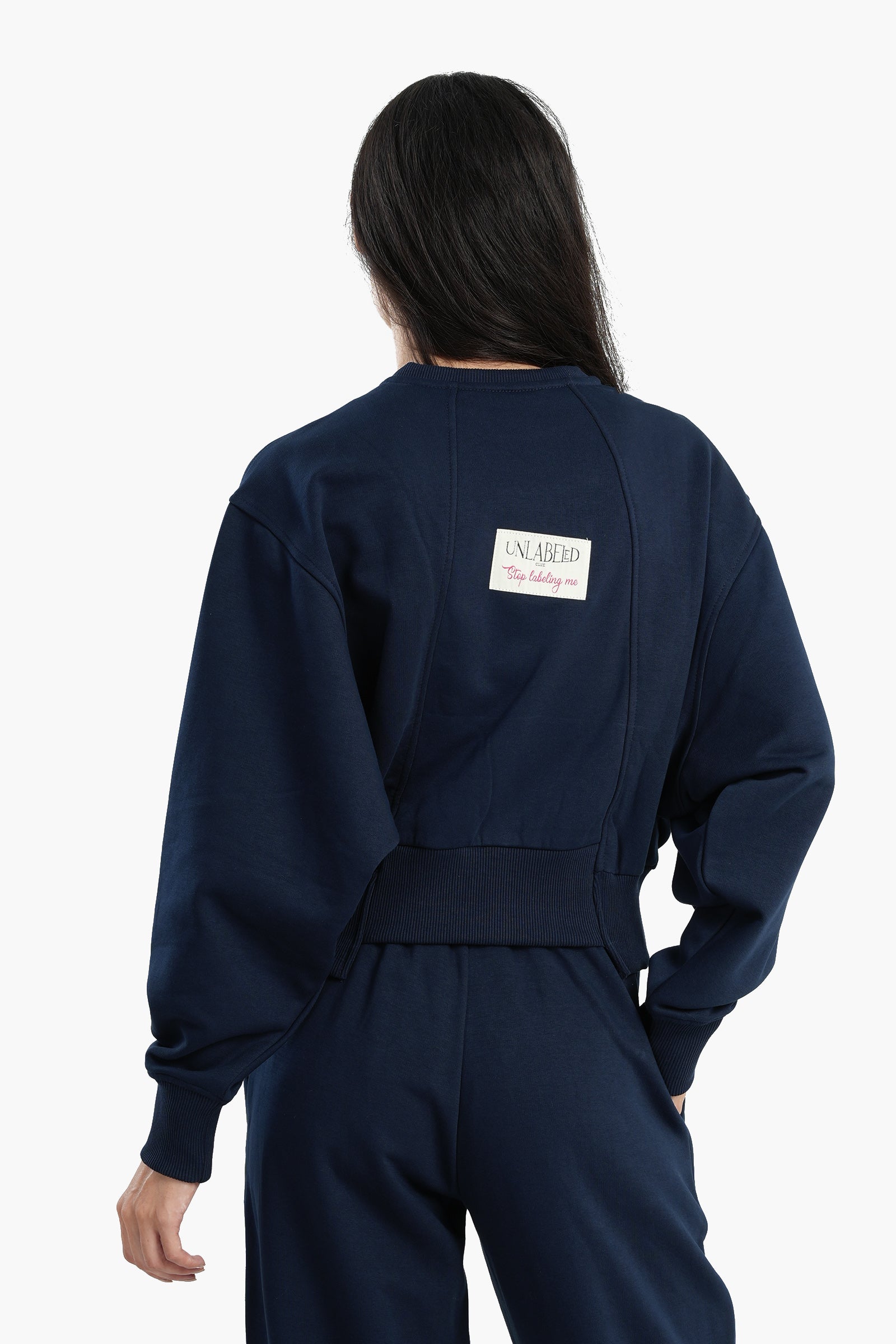 This navy lounge sweatshirt, crafted from premium Milton fabric, combines comfort with a bold statement. Designed with a regular fit, it features a trendy cropped design that pairs well with both high-waisted bottoms and relaxed loungewear. The sweatshirt showcases a striking "Stop Labelling Me" slogan on the front, which adds an element of individuality and empowerment to your casual look. The contrasting patch on the back further enhances its unique appeal. With a round neck, long sleeves, and dropped shoulders, this sweatshirt ensures ease of movement and a laid-back vibe. The matching ribbed elastic trims at the cuffs, hem, and neckline provide a snug fit, making it a perfect piece for everyday wear.