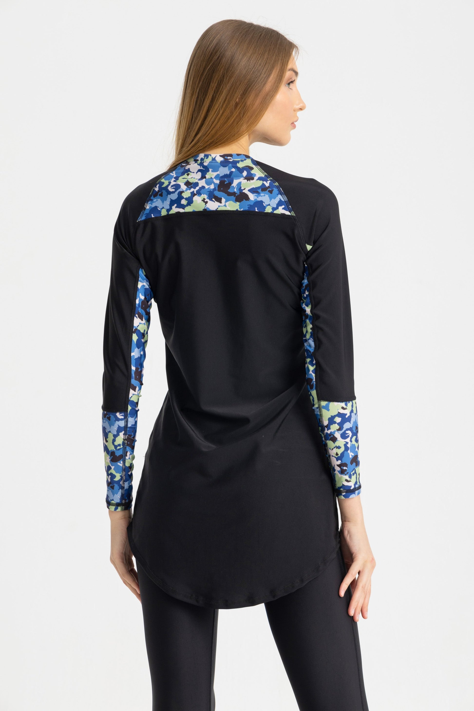 Top Design & Fit: Long-sleeve modest swim tunic with printed sleeve cuffs