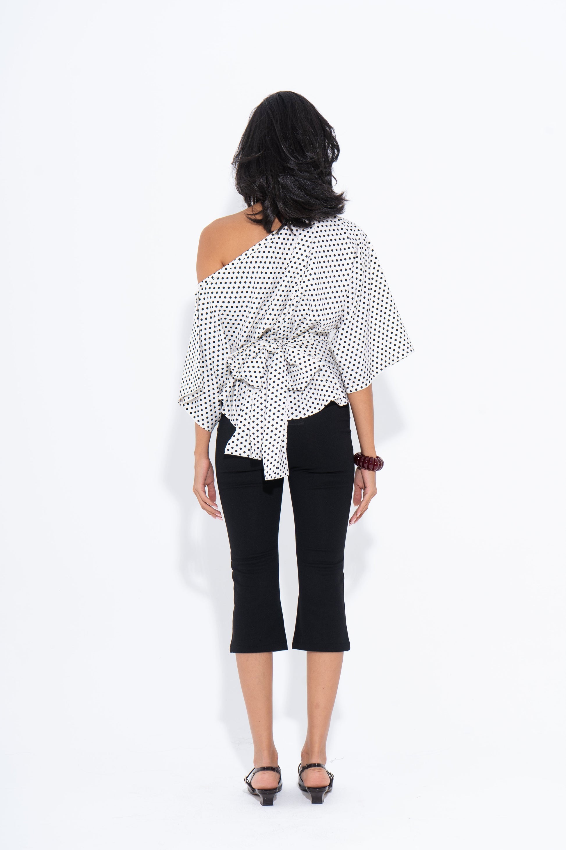 - Design: One-shoulder blouse with draped bodice and cinched waist