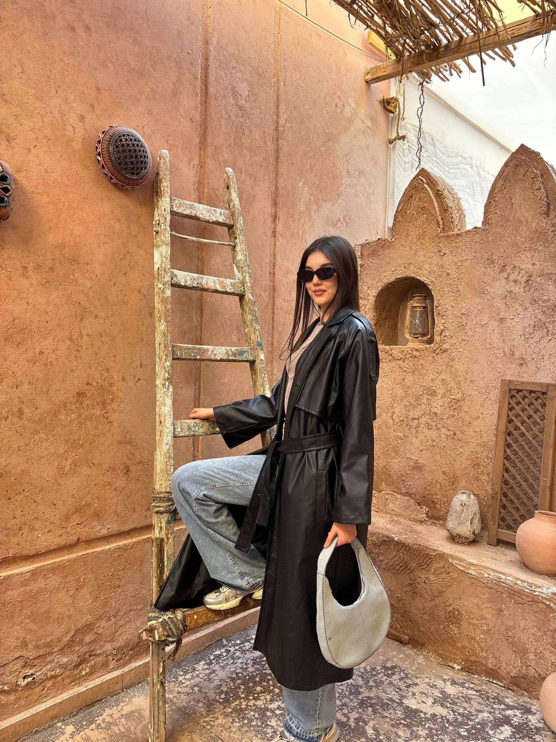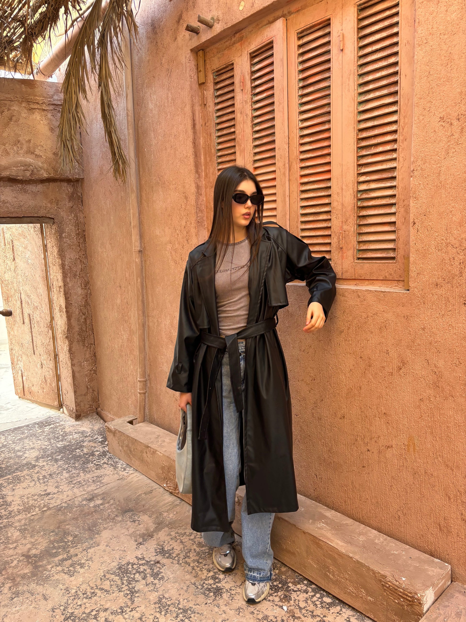 - Pattern/Design: Solid black, minimalist trench silhouette