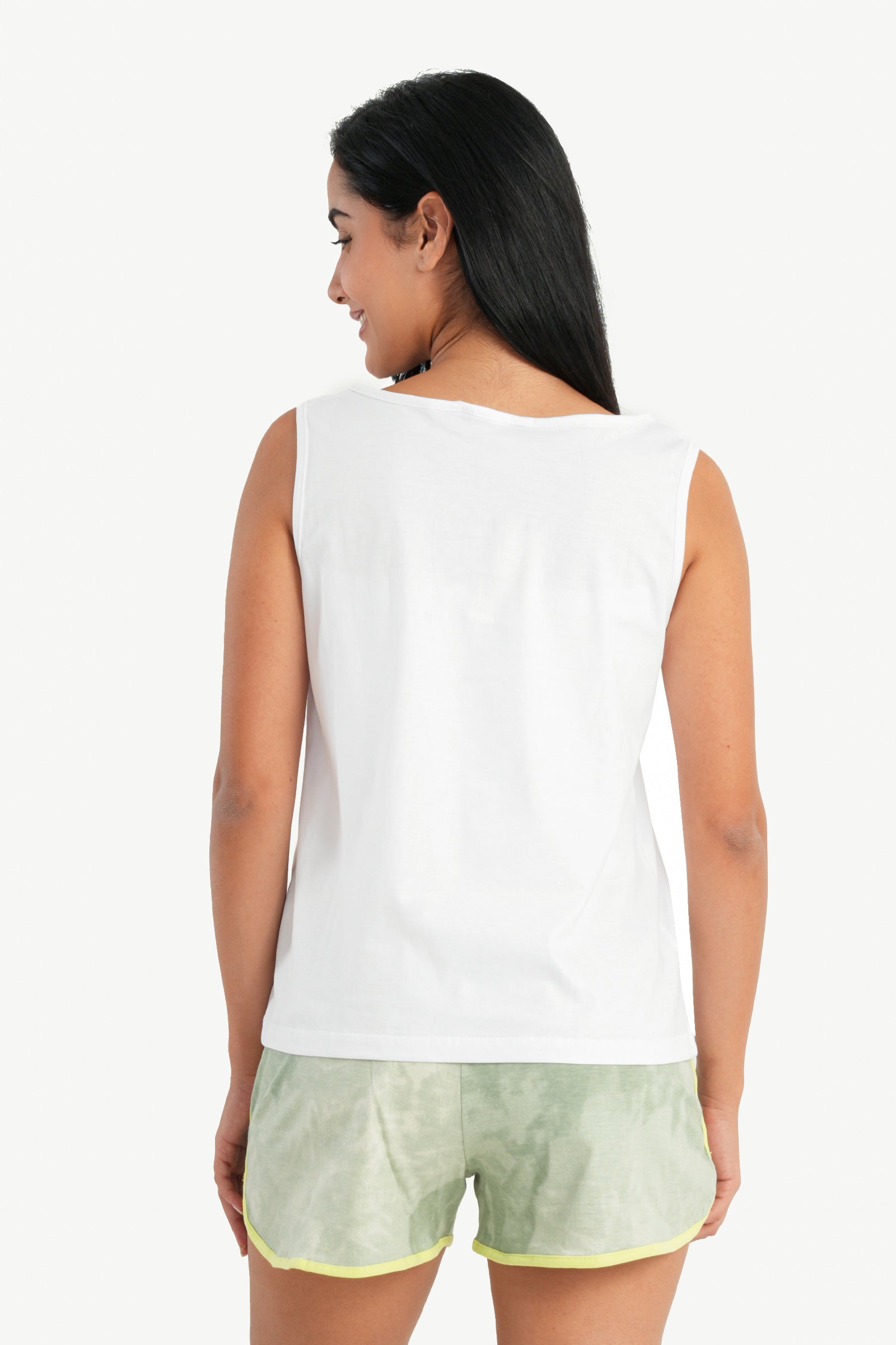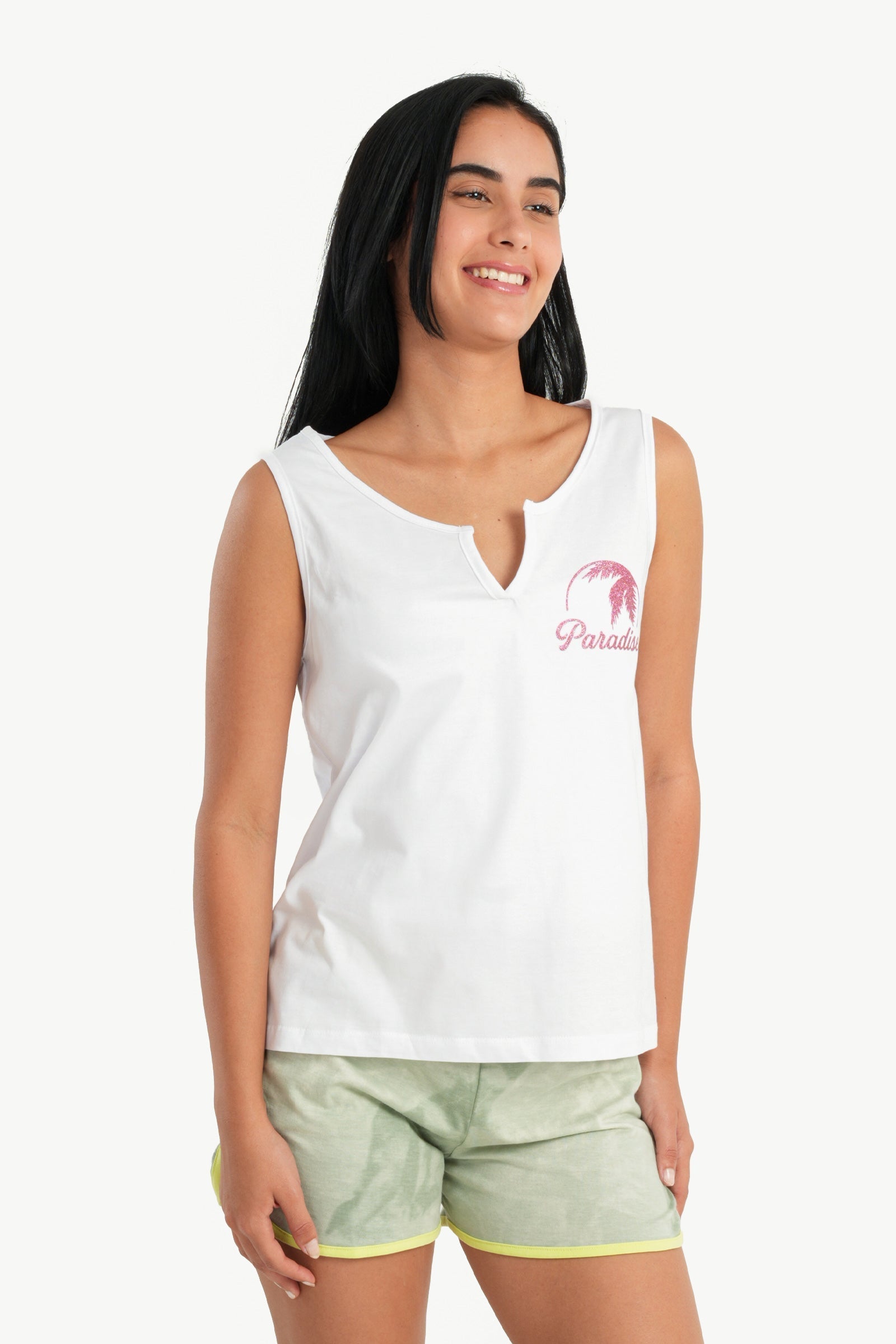 The top features a solid pattern with the word "Paradise" printed across the front, offering a simple yet chic look. It has a round neck with a subtle V-cut, sleeveless design, and a regular fit, making it ideal for warmer nights.
