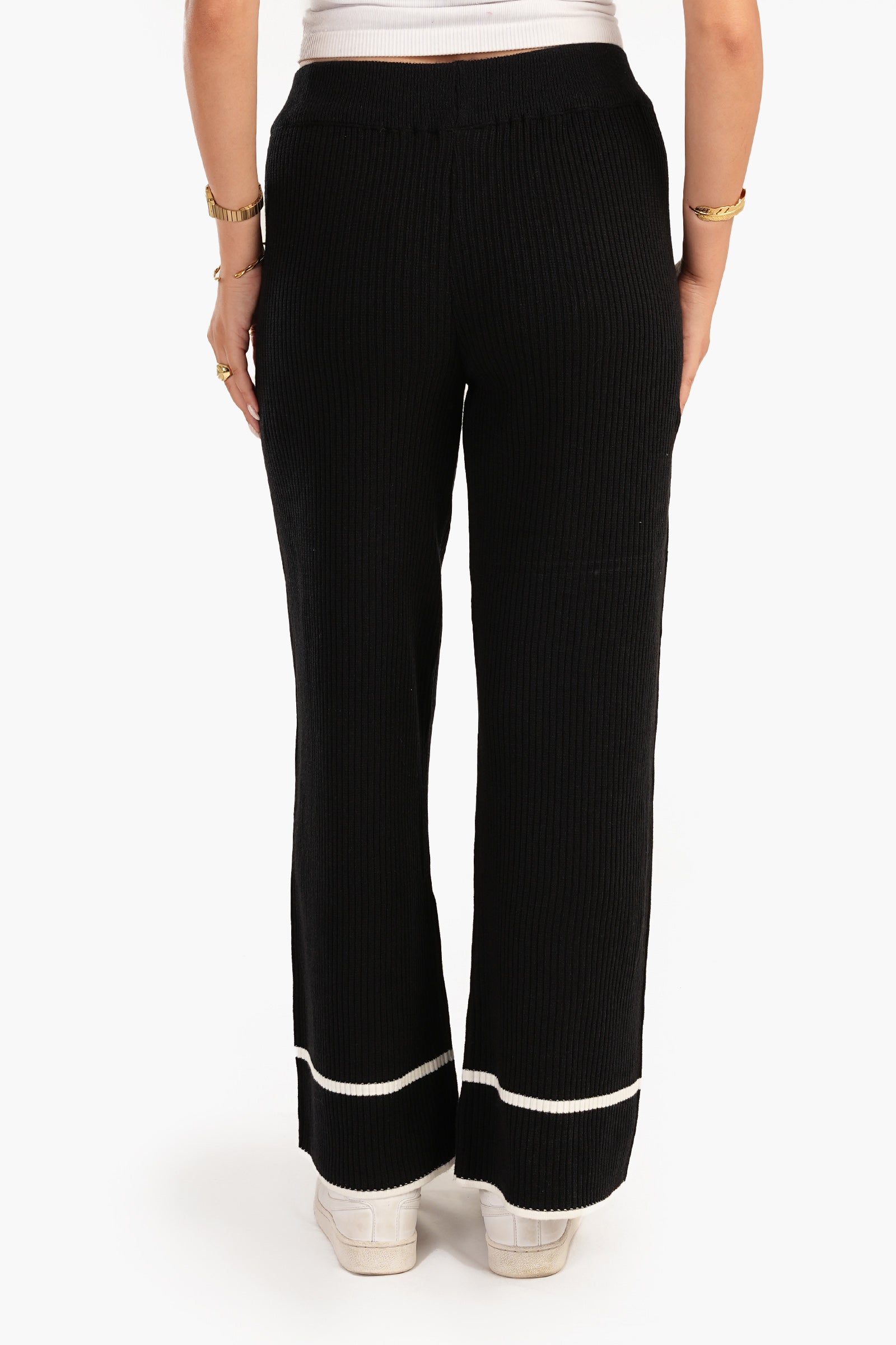 Elevate your loungewear with these stylish lounge pants crafted from soft Trico fabric. Featuring a relaxed fit and ribbed pattern, they offer both comfort and a modern touch. The high elastic waist ensures a secure and comfortable fit, while the straight cut provides a flattering silhouette. The full-length design is enhanced with two contrasting stripes at the hem, adding a sporty and contemporary detail. Easy to pull on, these lounge pants are perfect for relaxing at home or running errands in style.