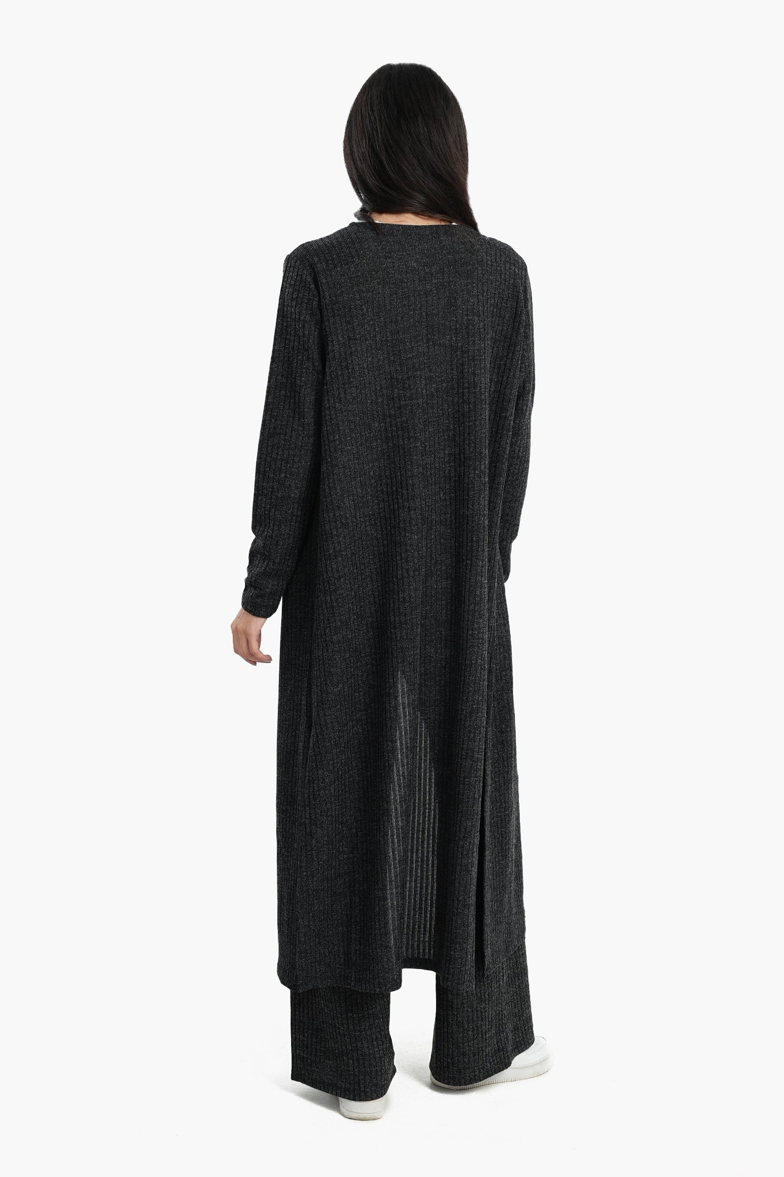 Ribbed Long Open Front Cardigan - Dark Grey