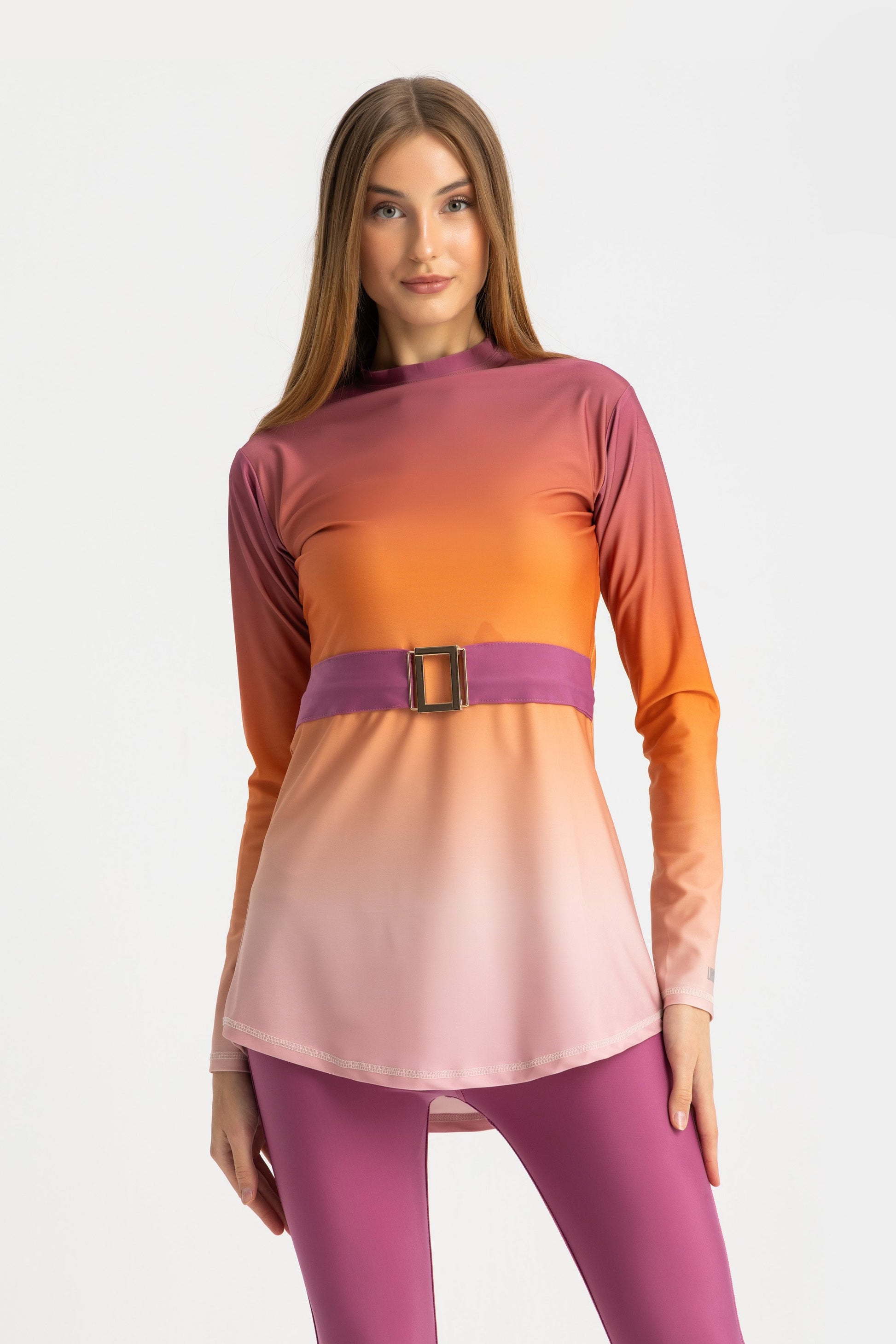 Coverage Level: Modest full coverage (top extends past hips, paired with full-length leggings)