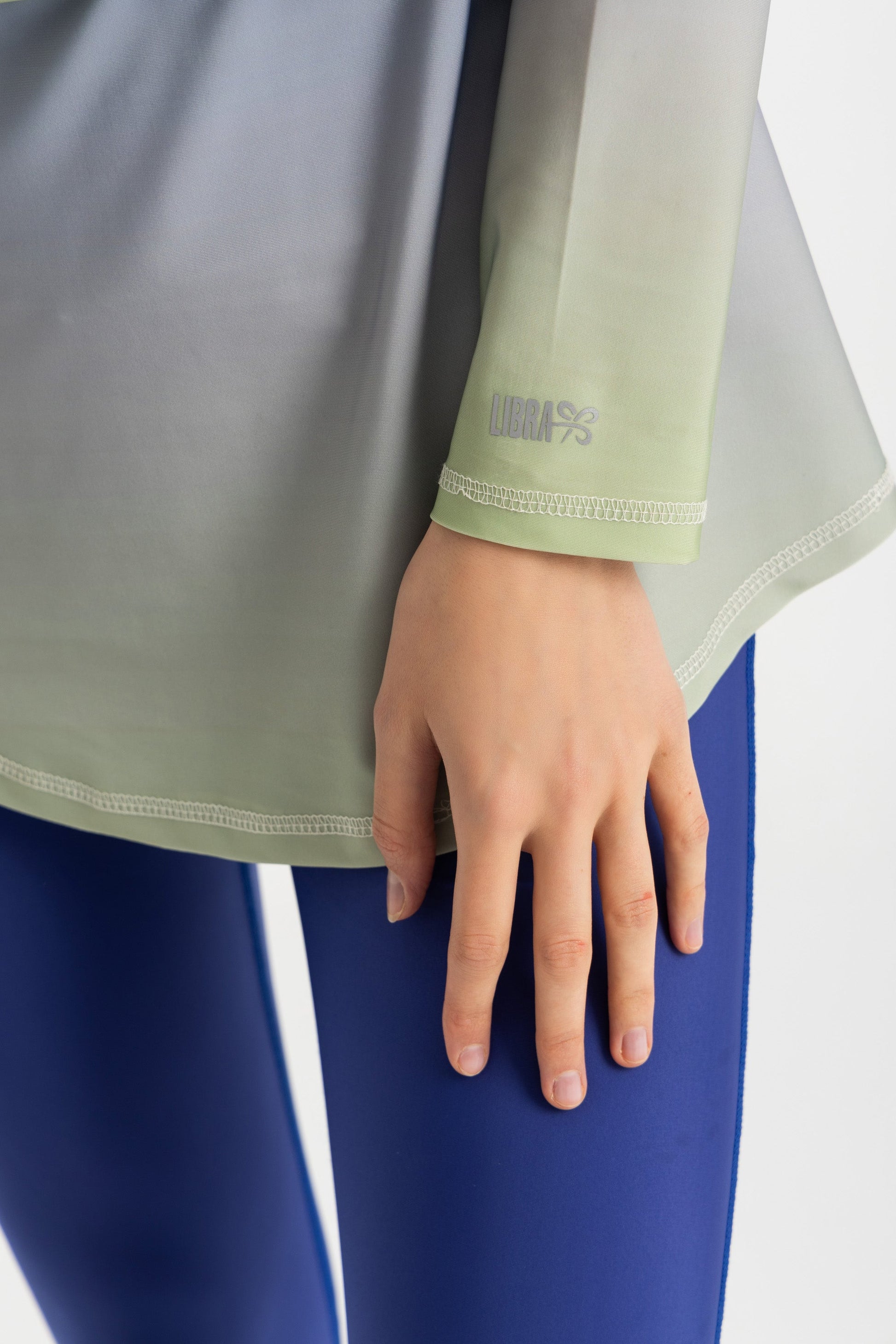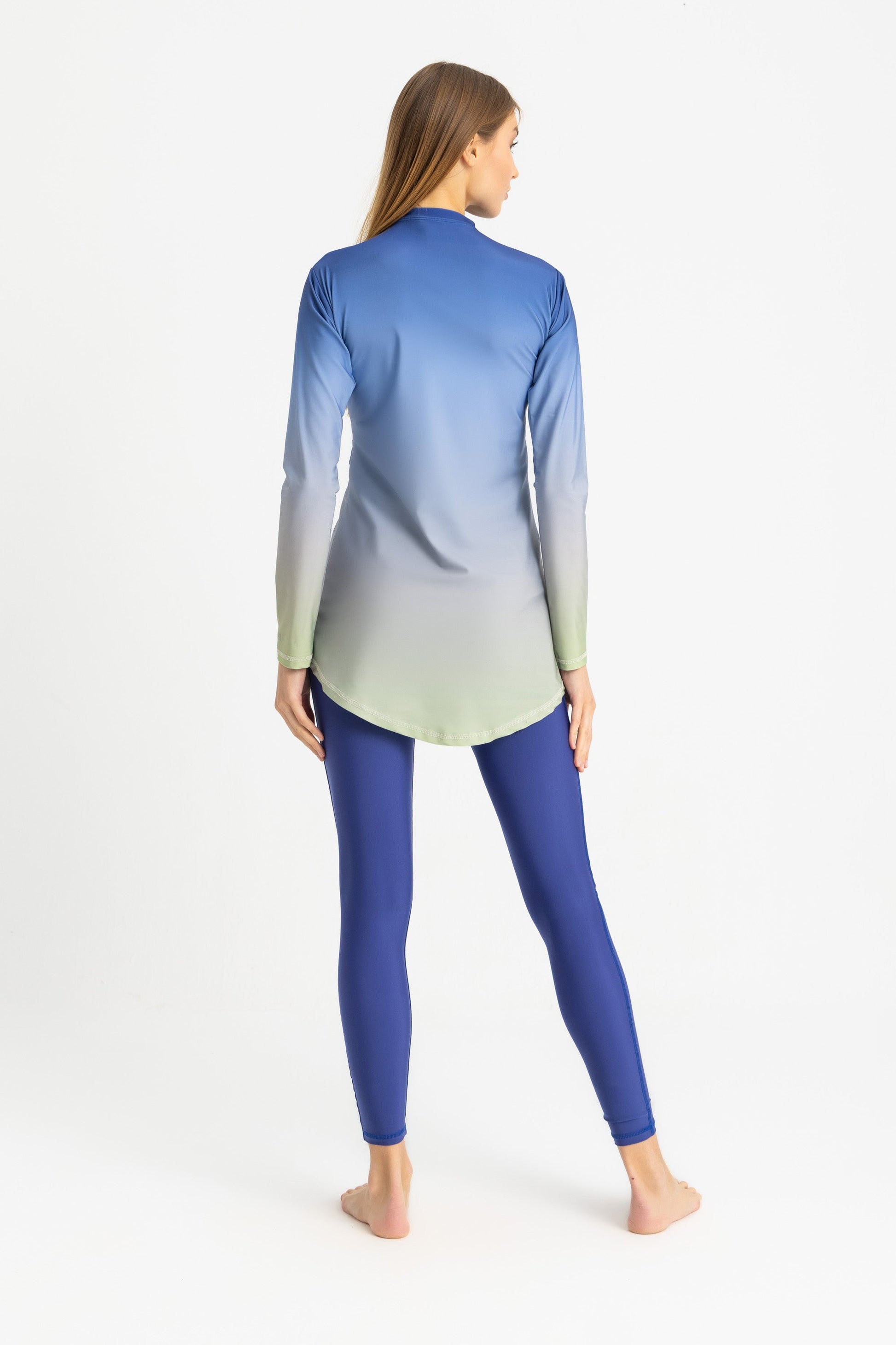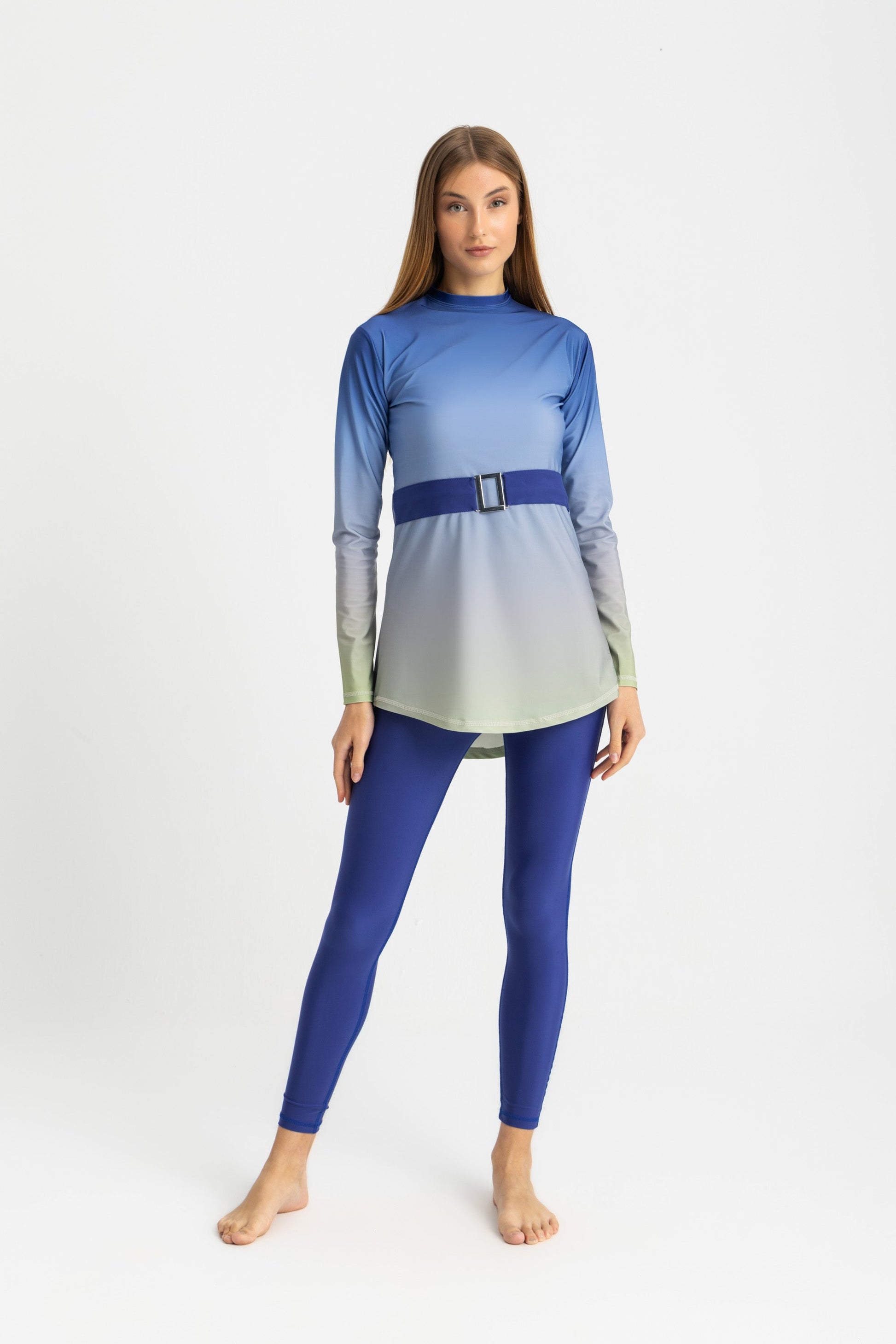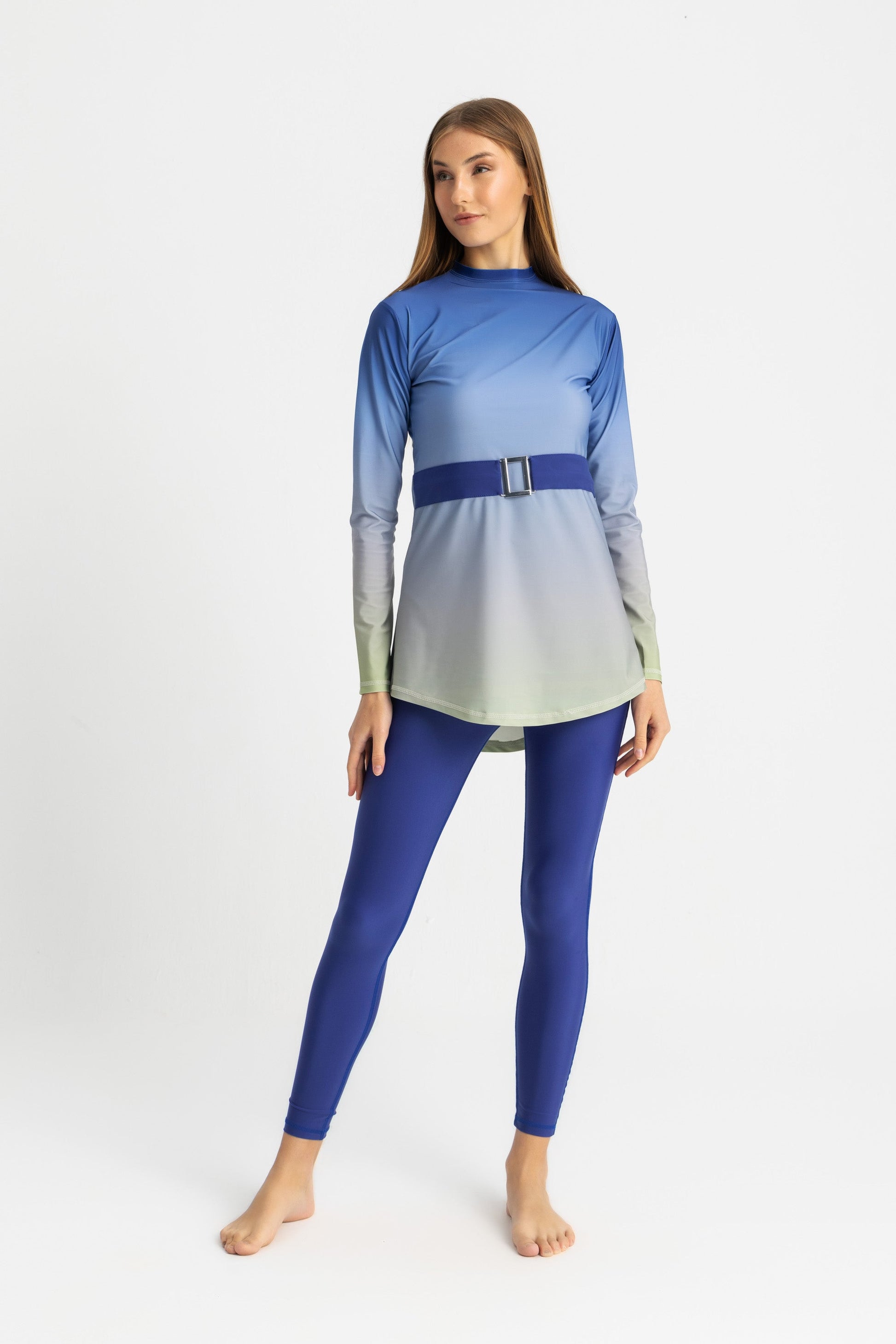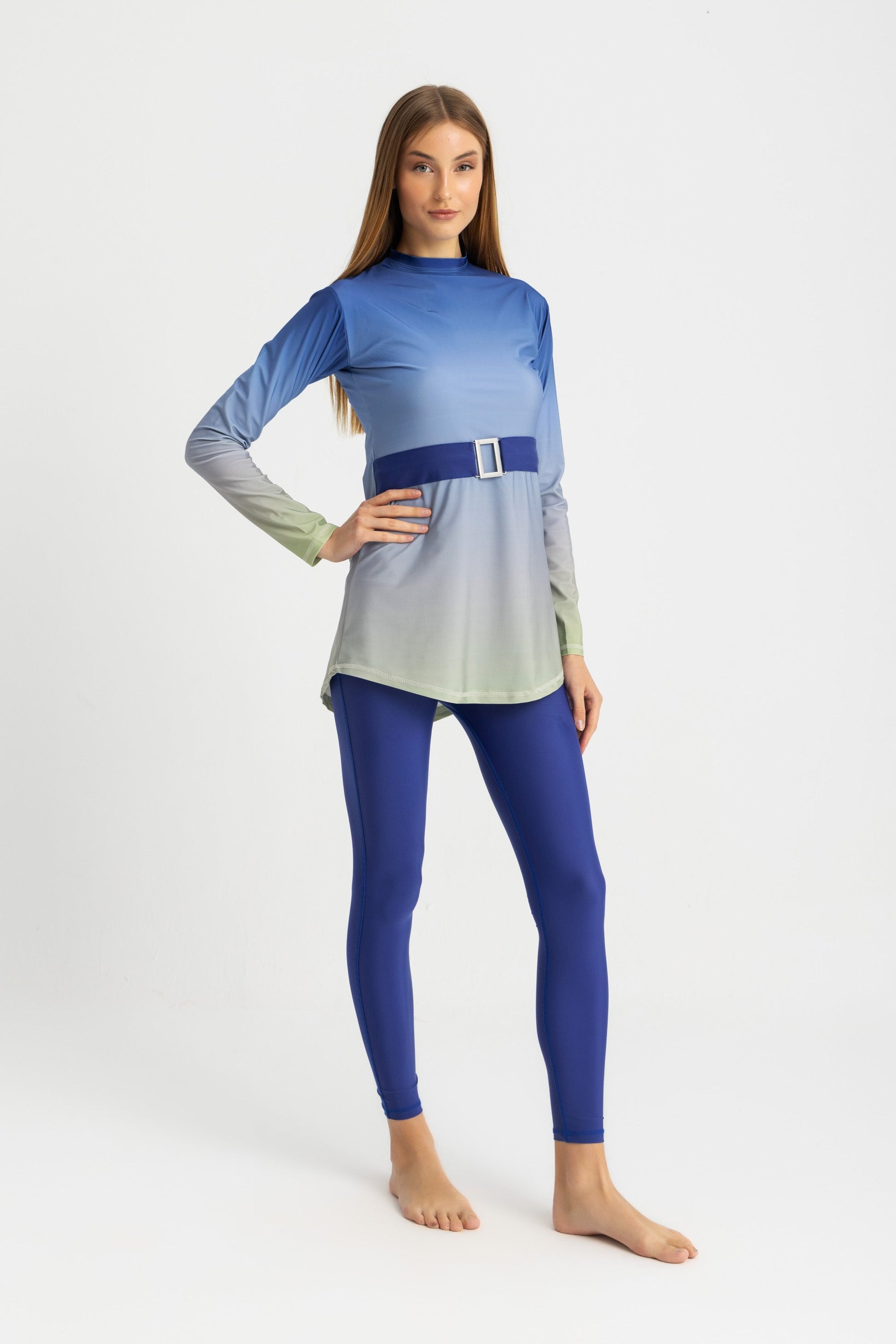 Coverage Level: Modest full coverage (top extends past hips, paired with full-length leggings)