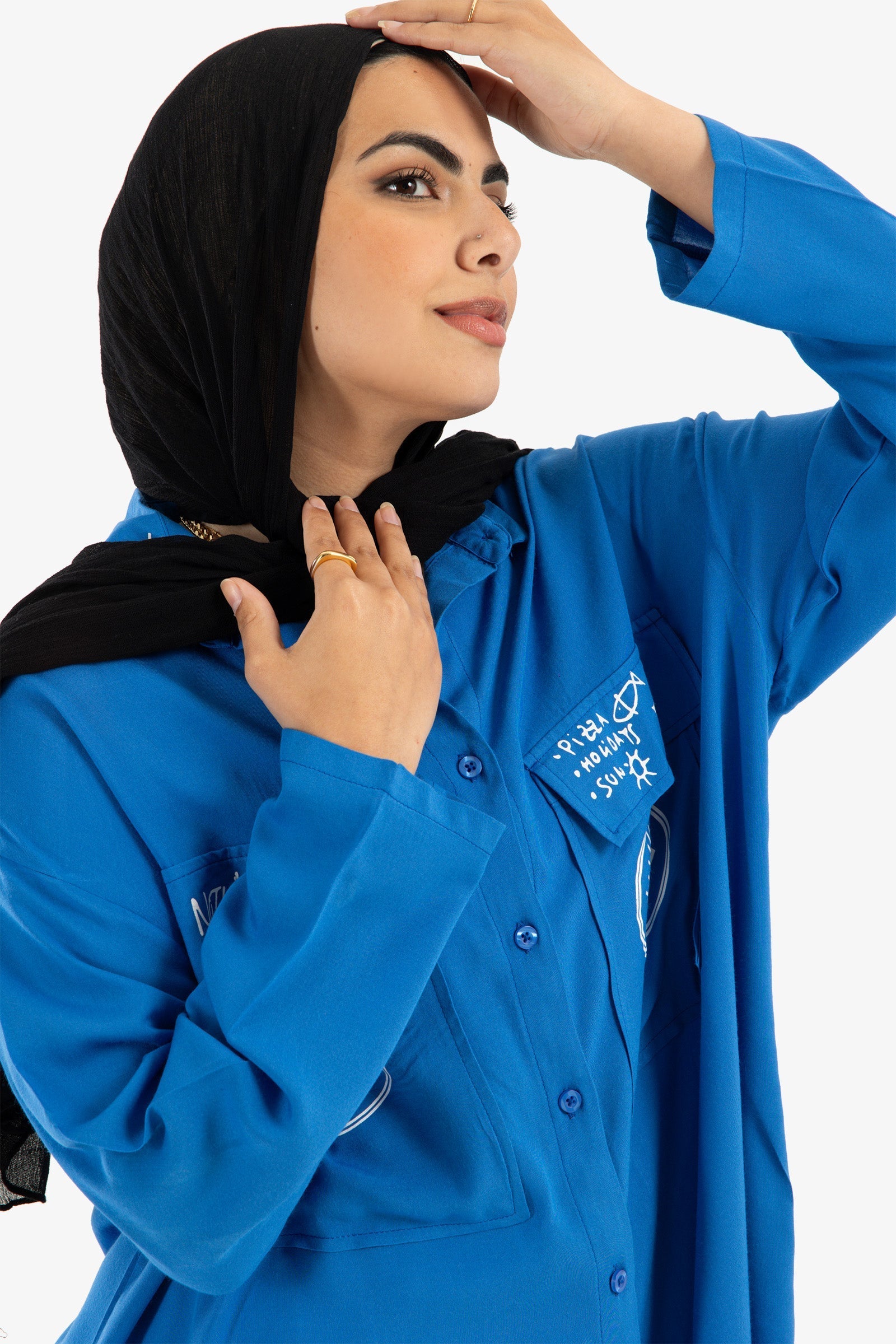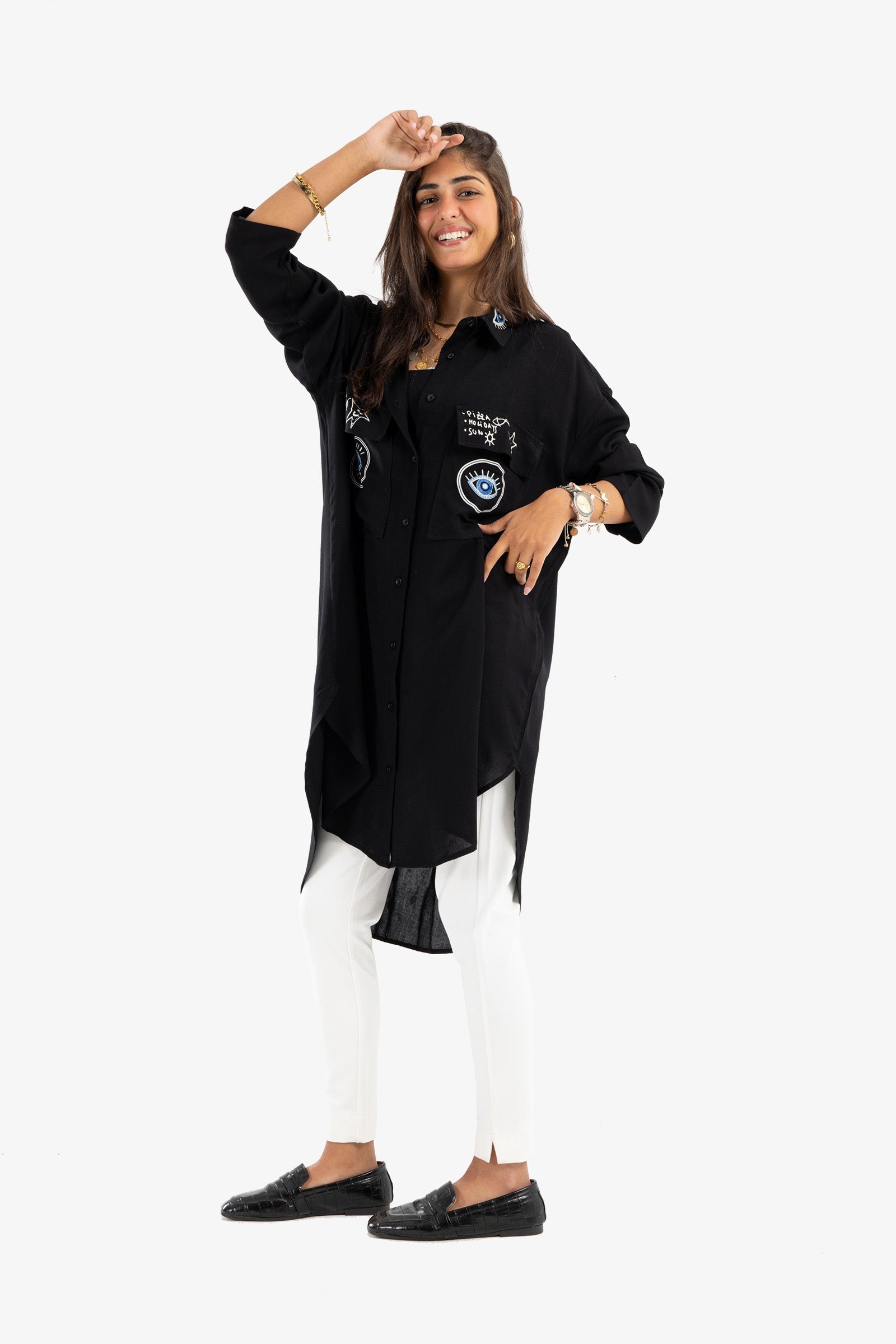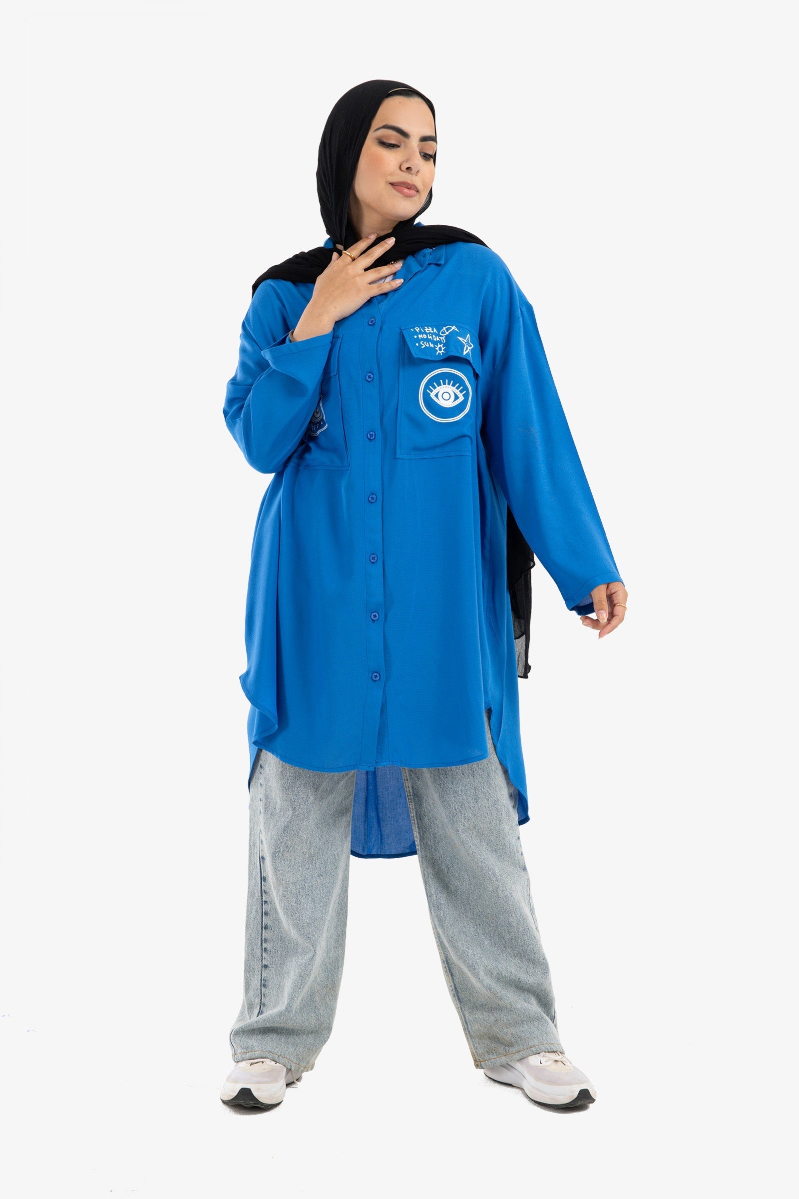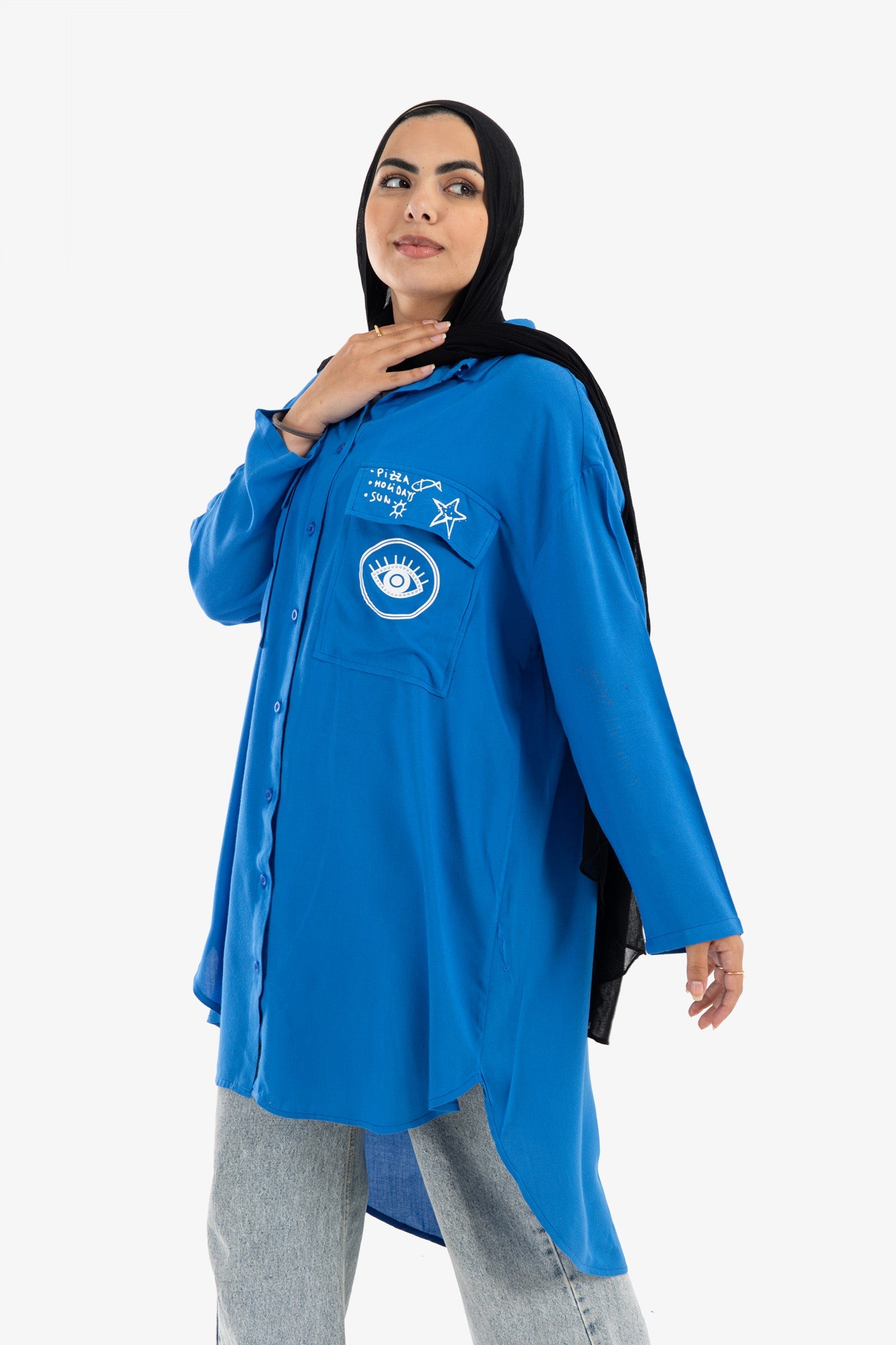 - Elevate your casual wardrobe with our loose-fit shirt, a versatile piece that combines comfort with style. The relaxed silhouette drapes elegantly, offering a laid-back yet chic look that effortlessly transitions from day to night. Featuring printed chest pockets, this shirt adds a playful touch to your outfit, while the rounded hemline adds a hint of femininity. Made from soft and breathable fabric, this shirt is perfect for all-day wear.