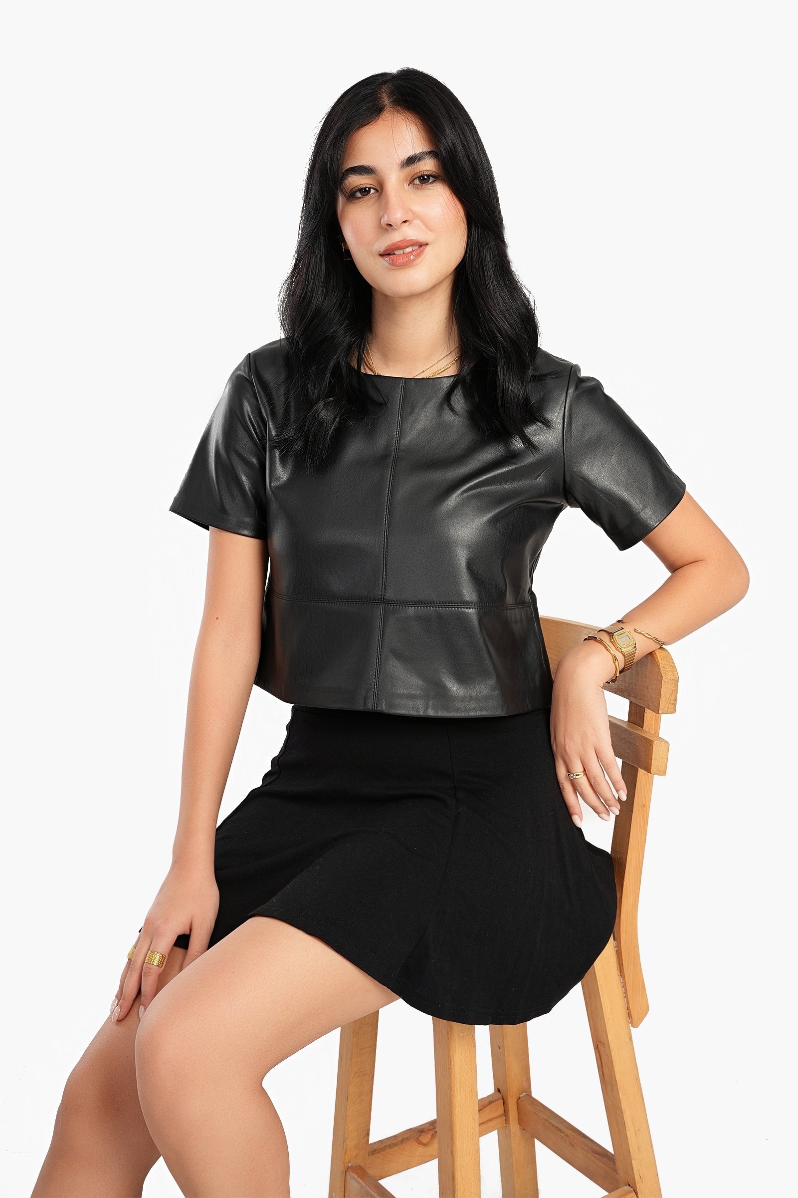 This black leather top is a bold statement piece that blends edgy style with a sleek, modern silhouette. Crafted from high-quality leather, it has a regular fit that hugs comfortably while offering a structured, polished look. The solid black pattern and round collar bring timeless appeal, while the short sleeves keep it versatile and easy to style. Designed as a slip-on, it’s a hassle-free piece that instantly elevates any outfit, adding a touch of sophistication and a hint of rebellious charm.