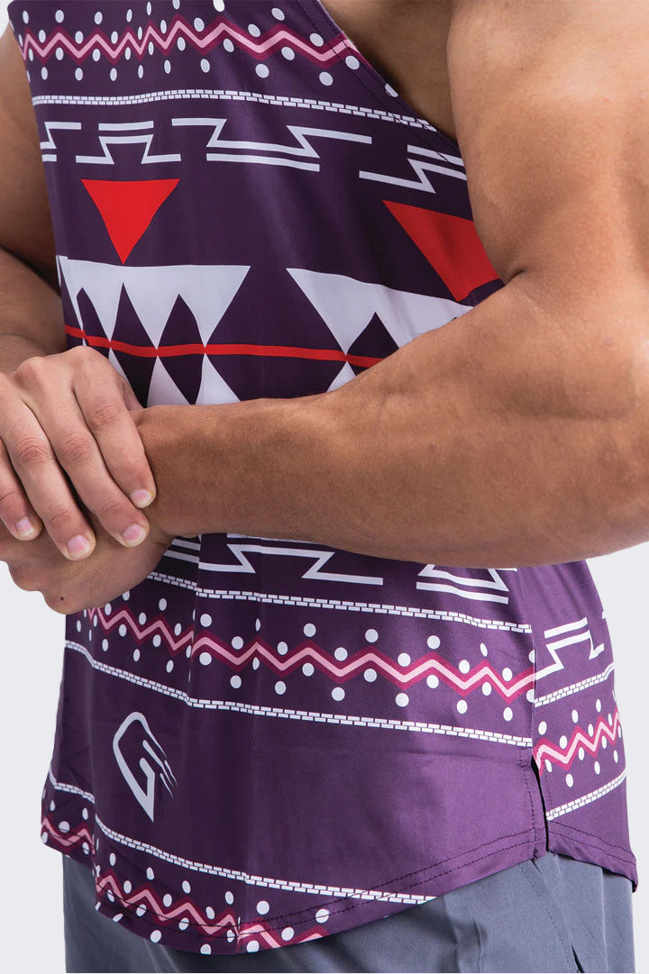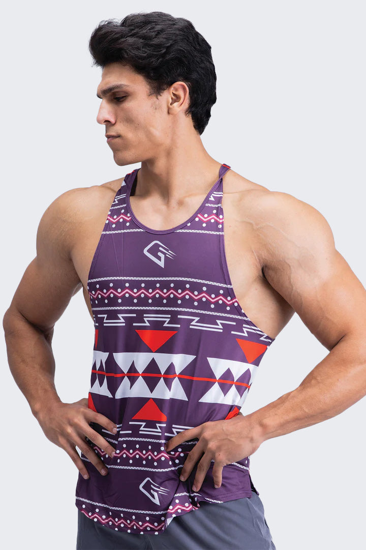 - Design: A form-fitting athletic tank top with a vibrant, geometric pattern. The cut is designed for an athletic build.