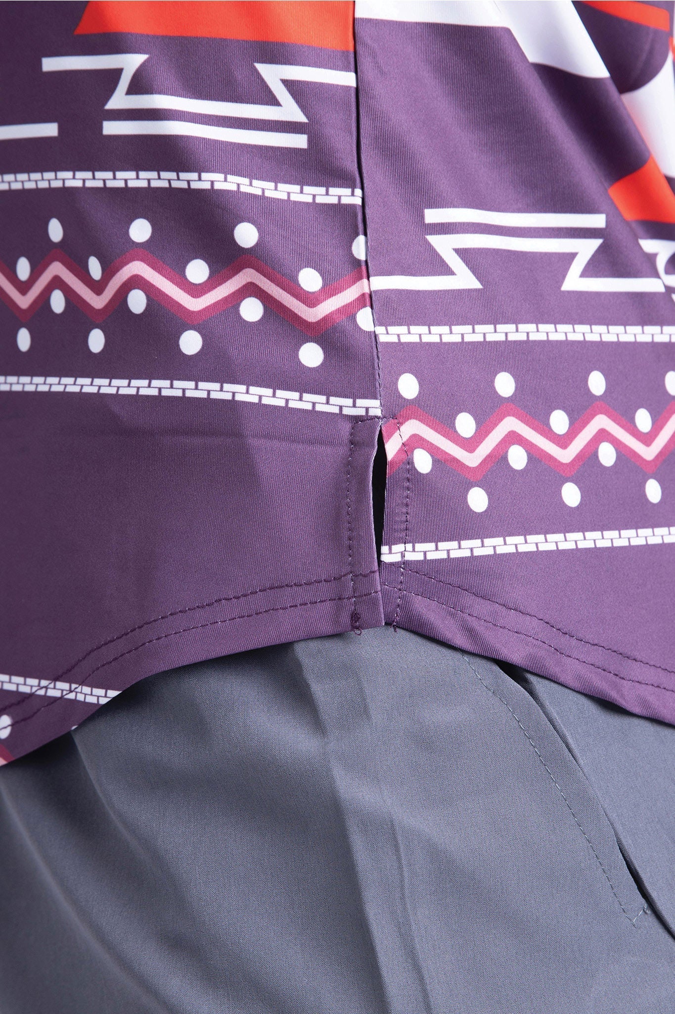 - Color: The primary color is a deep purple with a pattern in white, black, red, and pink.
