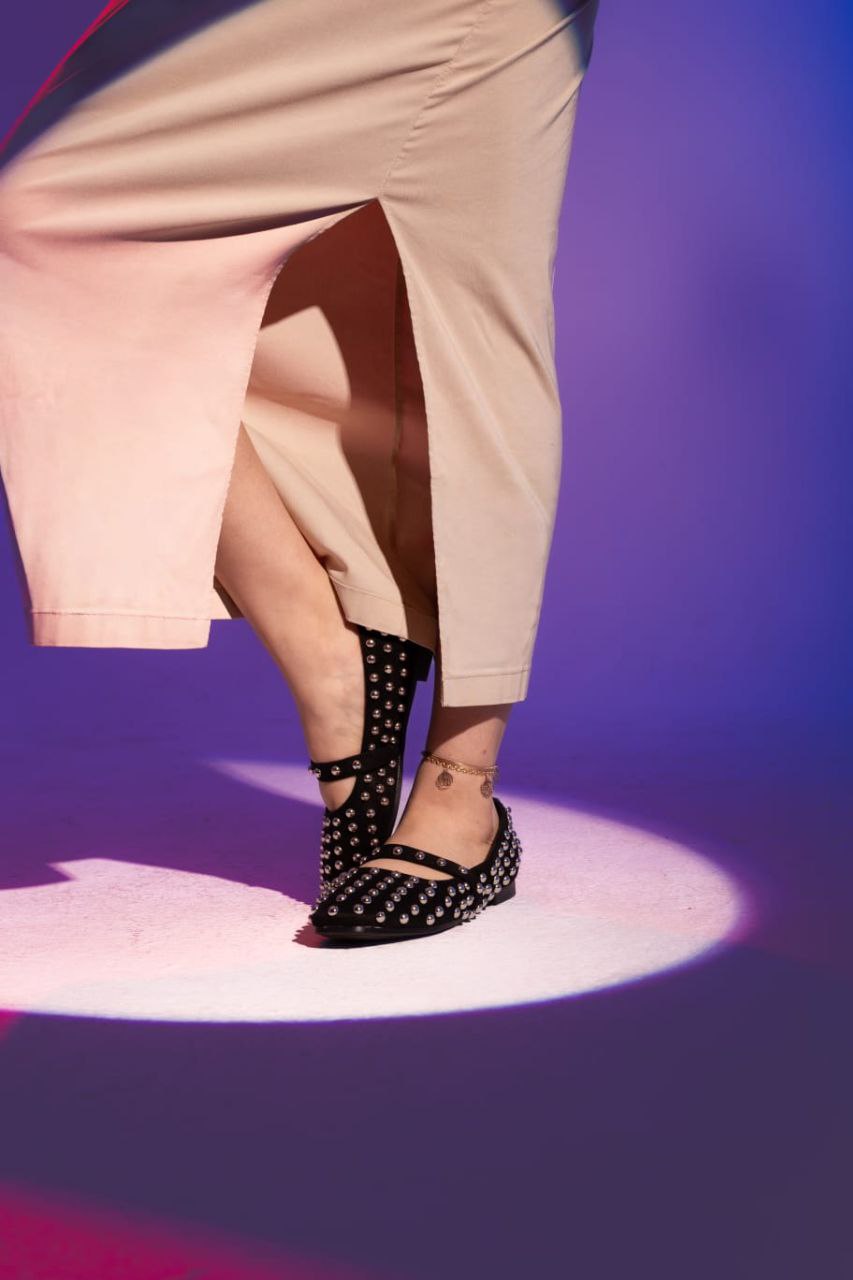 - Key Features: All-over metallic stud detailing, secure strap, cushioned insole, rich color