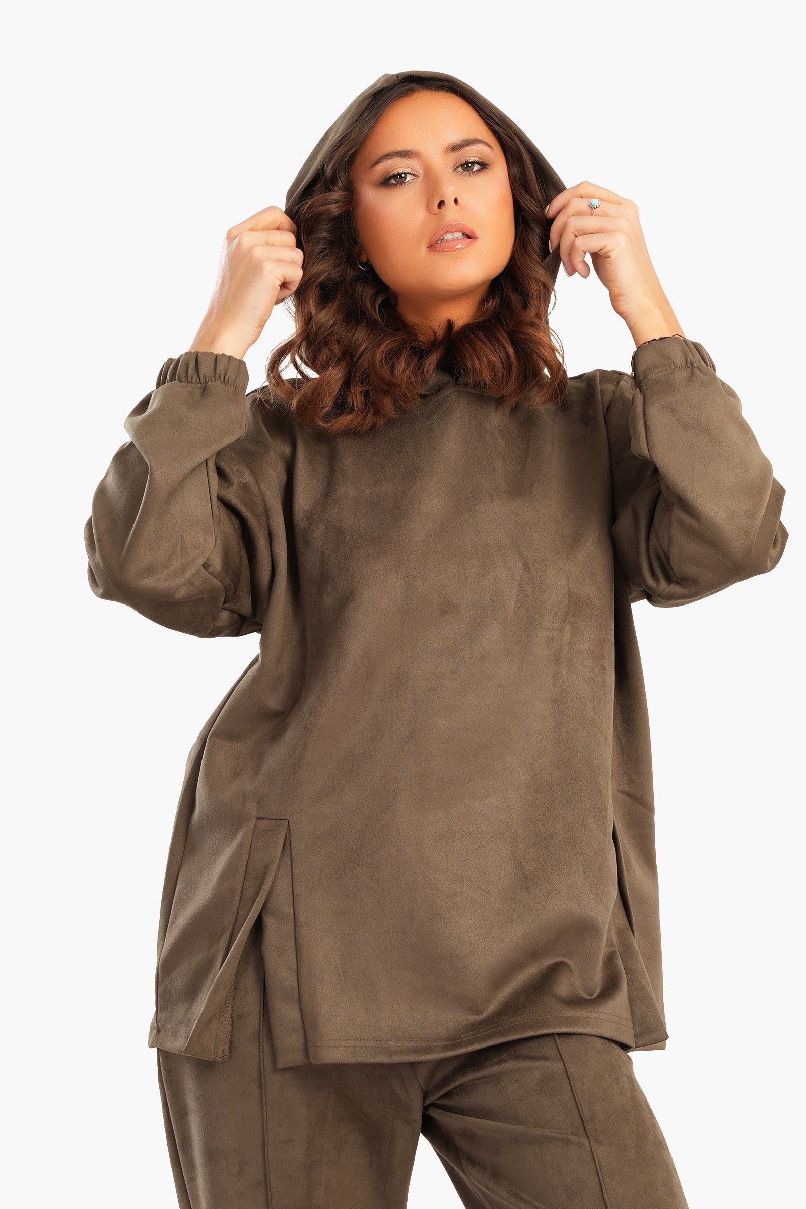 Featuring a hooded neck for added coziness, long sleeves with elastic cuffs for a secure fit, and two front slits for a stylish twist, this hoodie combines functionality with fashion. The convenient slip-on design makes it perfect for effortless wear, whether you're relaxing at home or stepping out for a casual outing.