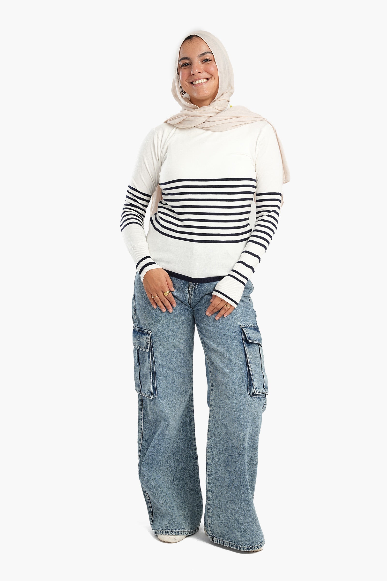 - Elevated Casual: Dress up the pullover by tucking it into a high-waisted skirt, preferably in a solid color to balance the stripes. Add tights and heeled boots for an elevated casual look that works for a day out or a casual dinner. The high neck and ribbed details add a chic touch to this simple yet stylish ensemble.