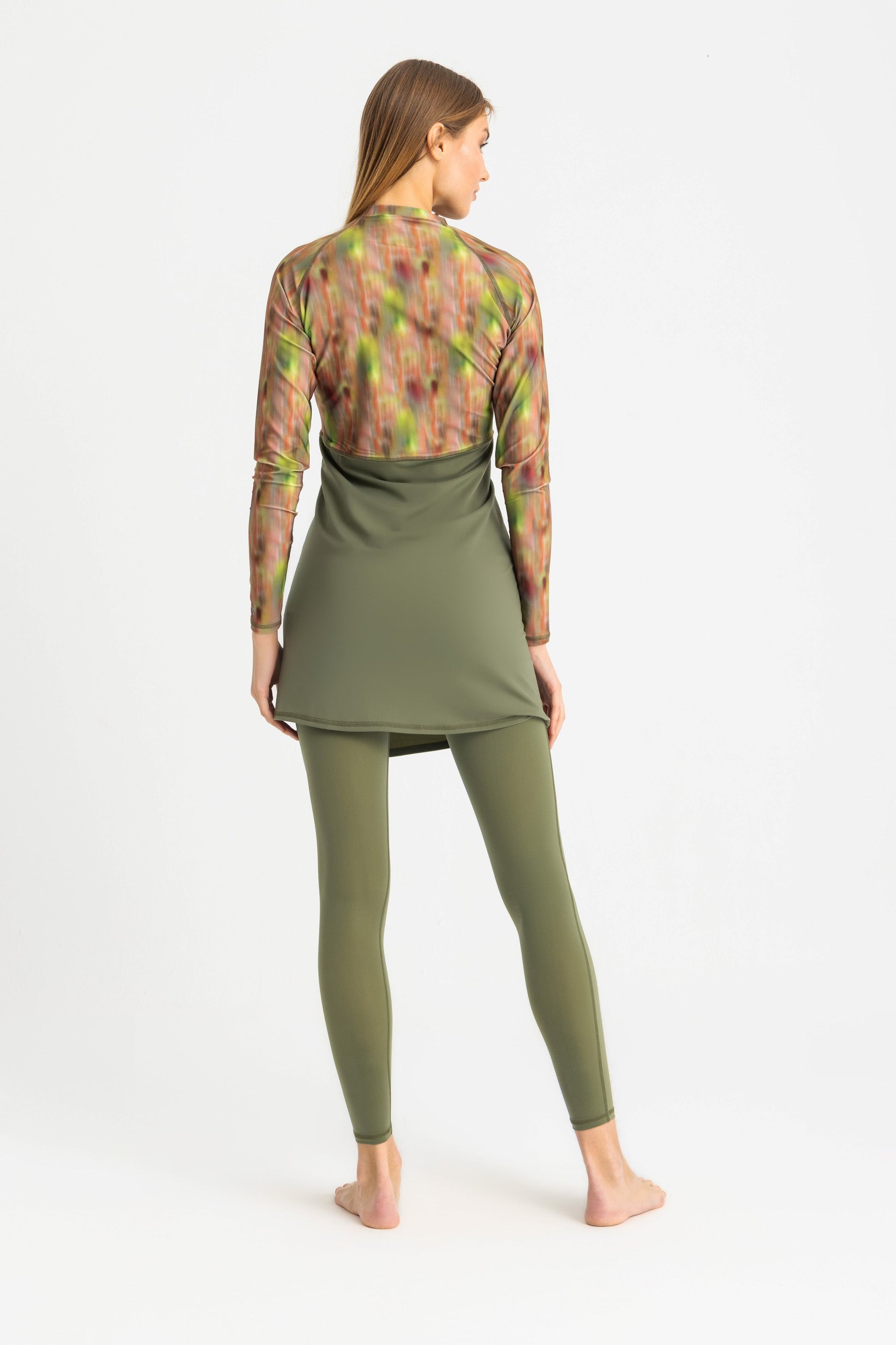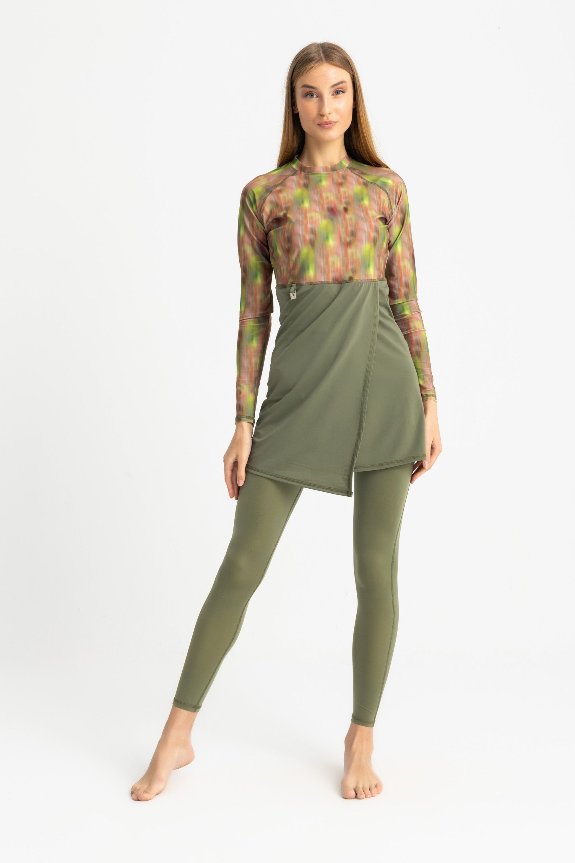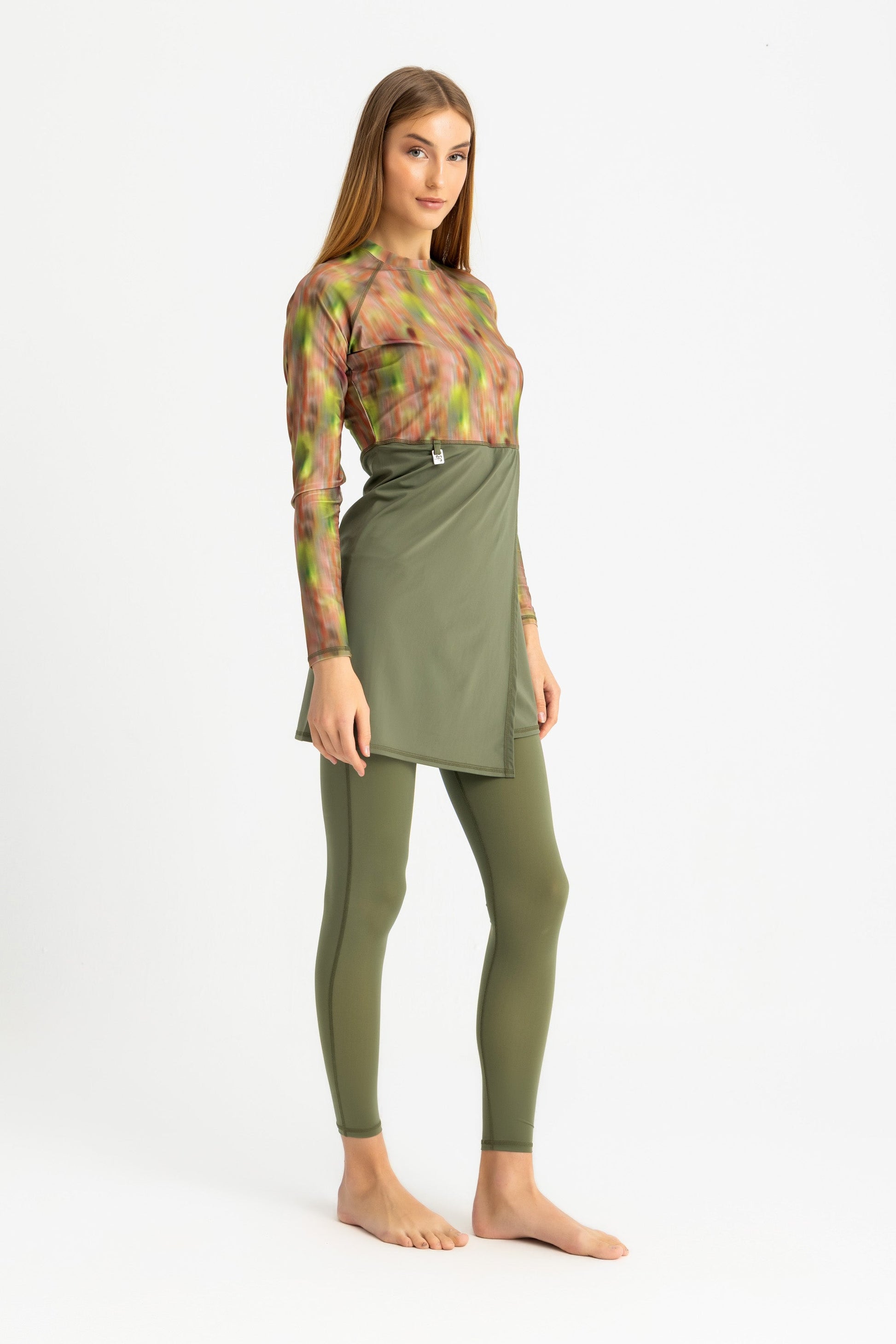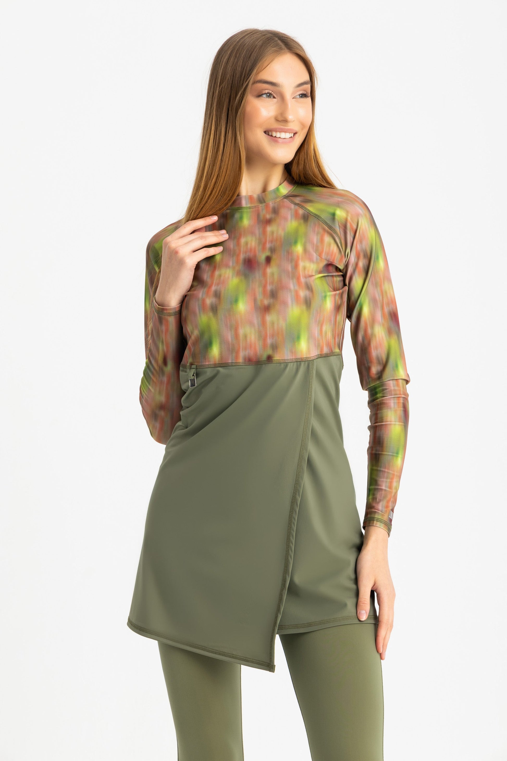 Design Details: Asymmetrical overlay skirt panel with side fastening detail for added modesty and style